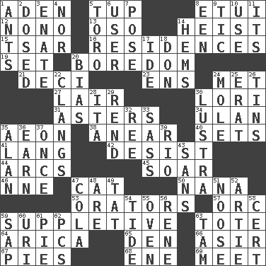 ACROSS 1. An important port of Yemen 5. Uncastrated adult male sheep 8. Needle case 12. Words to Nanette 13. Bear (Spanish) 14. Robbery 15. Russian ruler of old 16. Dwellings 19. Arrange properly for use 20. Mood resulting from idleness 21. Tenth: prefix 23. Followers of ems 24. Was introduced to 27. Den 30. Australian parrot (variant) 31. Michaelmas daisies 34. Uhlan (variant) 35. Period of immesurable duration 38. Approach 40. Puts into a specified state 41. Austrian-born American filmmaker Fritz 42. Cease 44. Arches 45. Fly high 46. Compass dir. 47. Domesticated feline 50. Nanny 53. Speakers 57. The grampus (Milton) 59. Supplying deficiencies 63. Haul 64. N. Chile seaport 65. Lair 66. SW Saudi Arabia district 67. Sliced desserts 68. Compass dir. 69. Confront DOWN 1. Pismires 2. Administered medicine 3. Maternal 4. Not either 5. "Corrida" creature 6. One who makes use of a thing 7. Airs 8. Car or cant ending 9. Nervous spasm 10. Purpose 11. It is 14. Cloth borders 17. Binary compound 18. Spanish title 20. Prejudice 22. Rigngs loudly 24. Undercover agent 25. Part of Q.E.F. 26. Metal containers 28. Call ___ day 29. Tear apart 30. A period of five years 32. Portuguese money of account (variant) 33. Backtalk 35. Actor Alda or Thicke 36. Merit 37. Single time 39. River (Sp.) 43. Without 47. Root beer relative 48. "We ___ not amused" (Victoria) 49. Make lace 51. Trap for birds or small mammals 52. Nick name for Arthur 54. Periodic rise and fall of the sea level 55. Baking chamber 56. French philosopher Descartes 58. Foregone conclusion 59. Plant excrement 60. RI univ. 61. Sliced dessert 62. Personal Computers (abbr.) 63. Scottish cap