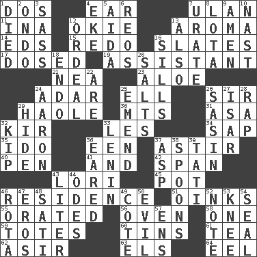 ACROSS 1. Two (Sp.) 4. Ewer handle 7. Uhlan (variant) 11. _ tizzy (2 wds.) 12. Migrant worker of the '30s 13. Odor 14. Begley and Asner 15. Redecorate 16. Chalkboards 17. Administered medicine 19. Helper 21. Teachers' org. 23. _ vera 24. The sixth month of the Jewish calendar 25. Pipe bend 26. Title for a knight 29. White Person, in Hawaii 30. Mountains (abbr.) 31. White ___ sheet 32. Apertif with cassis 33. French article 34. Plant excrement 35. Wedding promise 36. Car or cant ending 37. Moving or stirring 40. Fenced enclosure 41. Plus 42. Connect, as a bridge 43. Australian parrot (variant) 45. Cooking vessel 46. Home 51. Pig sounds 55. Declaimed 56. Baking chamber 58. Single 59. Lugs 60. Metal containers 61. Beverage made from leaves 62. SW Saudi Arabia district 63. Raised railways 64. Snakelike fish DOWN 1. Passed on 2. Southwest Nigerian state 3. Backtalk 4. Supplement with great effort 5. Opera by Verdi 6. Vintage cars 7. A salt of uric acid 8. Globular water bottle used in Asia 9. So be it 10. Political cartoonist Thomas 12. Severe or trying experience 13. In addition 16. Beverly of Met fame 18. Inside; within (prefix) 20. Table seasonings 22. "We ___ not amused" (Victoria) 24. Composer Copland 25. Make improvements or corrections to 26. Indian antelope 27. Austrian river, tributary to the Danube 28. Strike 29. Flintstone garb 32. Sleep 33. Soviet premier 1918-24 36. Having ears or earlike features 37. Cleo's killer 38. Soup utensils 39. Jacques of French films 43. 61 cubic inches 44. Lyric poems 46. Roll call or roster of names 47. Greek god of love 48. Suttee (variant) 49. ____ d'Azur (French Riviera) 50. Tending to cause great harm 52. Make mention of 53. Leg joint 54. Lick closed 57. Followers of ems