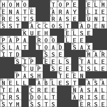 ACROSS 1. Like (prefix) 5. Drink excessively 9. Shade tree 12. Related on the mother's side 14. Like ___ of sunshine 15. Untruth 16. Musical pauses 17. To erase 18. Corn or form start 19. Fast jet (abbr.) 20. Buttonhole 23. Arabian gulf 24. Malaysian steamed pastry 25. Otherwise 27. Dad 30. Friend of Pooh 32. Area sheltered from the wind 33. Narrow board 34. Frog relative 36. Saxophone 38. It would 39. Compass dir. 40. Third mo. 43. Small drink 46. Snakelike fish 48. Lie 49. Uncastrated adult male sheep 51. Observe 52. Capri or Wight 53. Romantic infatuation 54. Adolescent 56. 1994 drama film starring Jodie Foster 58. Most capable 61. White ___ sheet 64. Afternoon social gathering 65. Algonquian 66. Rhinal 68. Big collection agency 69. Dunce 70. Ascend 71. Symbol (abbr.) 72. Fast planes 73. Celtic language DOWN 1. Possessive pronoun 2. Washington bills 3. Vertical spar for supporting sails 4. Baseball player Mel 5. Edible starchy tuberous root 6. Mouths or openings 7. Soft color 8. Sight organ 9. Evade 10. Actor's bit 11. Chow _ 13. Son of Isaac 21. An absolute certainty 22. Opt 23. Toward the sea 24. Krazy ___ of comics 26. French article 27. Air pressure measure (abbr.) 28. Keyboard modifier key 29. Writing tablets 31. Fertile tracts in a desert 35. Keyboard key 37. Dec. holiday 41. 100% 42. To riddle 44. Slanted text style (abbr.) 45. Fluid product of inflammation 47. Perceives with the eye 48. Metal container 50. N Egypt peninsula 53. Suffix with ecto or cyto 55. Inactive volcano in Sicily 56. Nuclear Threat Initiatives 57. Suggestive of the supernatural 59. Waist strap 60. Allows 61. SW Saudi Arabia district 62. Backtalk 63. Toward shelter 65. Music discs 67. "We ___ not amused" (Victoria)