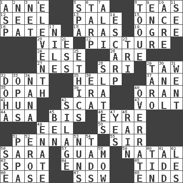 ACROSS 1. Queen of England 1702-14 5. R.R. building 8. Beverages made from leaves 12. Sew up the eyelids of hawks and falcons 13. Diluted with white 15. At one time in the past 16. Eucharist need 18. Ancient river in northeast Turkey 19. Legendary monster 20. Compete 22. Photo 24. Otherwise 26. "We ___ not amused" (Victoria) 27. A home for chicks 28. Indian title of respect (Mr.) 29. The 23rd letter of the Hebrew alphabet 32. Do not 35. Assist 37. A saturated hydrocarbon 38. Brightly colored fish 39. Retirement account (abbr.) 40. NW Algerian seaport 41. Attila the _ 42. Scram! 43. Electrical Unit 44. White ___ sheet 45. Altar cloth linen 46. Jane of fiction 49. Snakelike fish 50. Wither 51. Pre-World Series prize 55. Title for a knight 56. "Two Mules for Sister ____" 57. Island territory of the United States 59. Brizilian seaport 63. Specific locale 64. Inside; within (prefix) 65. Periodic rise and fall of the sea level 66. Relaxation 67. Compass dir. 68. Conclusions DOWN 1. Cleo's killer 2. Teachers' org. 3. Fish or hair follower 4. Veterans Day date 5. Health resort 6. Canvas cover 7. Mountain range southwest of Kyrgyzstan 8. Woman's close-fitting hat 9. Engineer (abbr.) 10. 1/640 square mile 11. Observe 14. Fortification 17. Mediterranean tributary 21. Curvy letter 23. Three (prefix) 25. Principles of right and wrong 28. Chalkboards 29. Pacific island yam 30. Of or related to the anus 31. Gone 32. Capital of the state of Qatar 33. Musical composition 34. Grandmother 36. Period 40. Make much ado about nothing 42. Fodder prepared in a silo 45. Benjamin's nick name 47. It is so 48. Water falling in drops from the sky 49. Maternal 51. Dad 52. Greek god of love 53. Religious women 54. Bits 56. Compass dir. 58. Cut the grass 60. Shallow baking pan 61. Find the sum of 62. French article