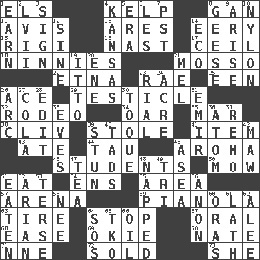 ACROSS 1. Raised railways 4. Seaweed 8. Separate the seeds from cotton 11. Advice 13. Ancient Greek god of war 14. Suggestive of the supernatural 15. Swiss mountan, "Queen of the Mountains" 16. Political cartoonist Thomas 17. To provide with a ceiling 18. Fools 21. With motion or animation 22. Inactive volcano in Sicily 23. Actress Charlotte 25. Car or cant ending 26. Adept person 29. One of the two male reproductive glands 32. Cowboy competition 34. Rowing implement 35. Spoil 38. 154 in Roman numerals 39. Took without asking 41. A distinct part 43. Had dinner 44. The 19th letter of the Greek alphabet 45. Scent 46. SAT takers 50. Cut the grass 51. Erode 54. Followers of ems 55. Length times width 57. Sports stadium 59. Player piano 63. Hoop that covers a wheel 64. Halt 67. Of the mouth 68. Comfort 69. Migrant worker of the '30s 70. Nathan's nickname 71. Compass dir. 72. Disposed of to a purchaser 73. A female animal or person DOWN 1. Merit 2. 57 in ancient Rome 3. Attach a signature 4. Sunflower state 5. Period 6. French article 7. Pacific Standard Time (abbr.) 8. Honkers 9. Ascend 10. Thermoplastic polyamide 12. Trig term 14. Environmental prefix 19. "Tell ____ the Marines!" 20. Compass dir. 21. Cartoonist voice _ Blanc 23. Monetary unit of Yemen 24. Measure of real estate 26. Curve 27. Root beer relative 28. Prepare for publication 30. Woman's close-fitting hat 31. Independent ruler or chieftain 33. Nights before holidays 36. Smallest unit of an element 37. San ____ (Riviera town) 39. Surprise greatly 40. Bits 42. Informal term for the mouth 45. At sea 47. Afternoon social gathering 48. Slept 49. Three (prefix) 51. Ingested 52. Believer in; advocate of (suffix) 53. Laconic 56. At once, immediately (arch.) 58. Born 60. Mouths or openings 61. Thin strip of wood or metal 62. Toward shelter 64. Mayday 65. Ring climax 66. Lubricate