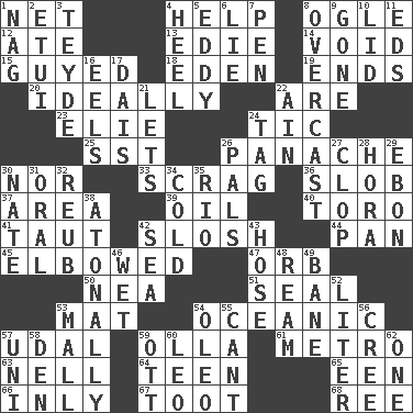 ACROSS 1. Fish or hair follower 4. Assist 8. Stare 12. Had dinner 13. Singer Brickell 14. Empty area or space 15. Steadied 18. Paradise 19. Conclusions 20. Under perfect conditions 22. "We ___ not amused" (Victoria) 23. Writer Wiesel 24. Nervous spasm 25. Fast jet (abbr.) 26. Flamboyance 30. Not either 33. Lean end of the neck 36. Oscar Madison type 37. Length times width 39. Petroleum 40. "Corrida" creature 41. Drawn tight 42. Make a splashing sound 44. Baking dish 45. Turned at an angle; bent 47. Globe 50. Teachers' org. 51. Lick closed 53. Floor covering 54. Pertaining to the sea 57. Allodial 59. Water jar 61. Paris' subway 63. 1994 drama film starring Jodie Foster 64. Adolescent 65. Car or cant ending 66. In an inward manner 67. A blast of a horn 68. To separate or throw off DOWN 1. Tired old horse 2. Needle holder 3. Miss Universe 1986, Barbara Palacios _ 4. The bottom of a shoe or boot 5. Whirlpool 6. Untruth 7. Animal enclosure 8. Cloudy 9. Went 10. Hat (slang) 11. Begley and Asner 16. Snakelike fish 17. Raised platform 21. Allows 22. The 18th letter of the Arabic alphabet 24. Label 26. Friends 27. Hoof sound 28. Israeli folk dance 29. Inky black, to poets 30. Nathan's nickname 31. Of the mouth 32. Reuben's nickname 34. Lacking warmth 35. River (Sp.) 38. Without tonality 42. Ocean 43. Stockings 46. Soggy 48. 480, 500 or 516 sheets of paper 49. Object of repulsion 52. 61 cubic inches 53. Promenade 54. Margarine 55. Patter 56. Algonquian 57. Corn or form start 58. Lair 59. Baseball player Mel 60. Lion 62. Single