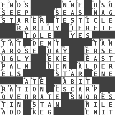 ACROSS 1. Conclusions 5. Compass dir. 8. Bear (Spanish) 11. Ooze 12. Oceans 13. Tired old horse 14. A viewer who gazes fixedly 17. A testis 19. Noteworthy scarcity 21. Cigar-shaped 22. Lacquered or enameled metalware 23. Consenting reply 24. Make lace 27. Scratch 29. Scottish cap 32. Came up 34. 24 hours 36. Celtic language 37. Unsightly 38. Supplement with great effort 39. 90 degrees 40. Inside of hand 41. Lair 42. Tree or shrub in the Birch family 43. Raised railways 44. Play the lead 46. Compass dir. 47. Had dinner 50. "This won't hurt ____!" 52. Food allowance for one day 55. Fortification 57. Make much ado about nothing 59. Sounds asleep 62. Metal container 63. Comedian Laurel of Laurel & Hardy 64. The longest river in the world 65. Find the sum of 66. Barrel 67. Send forth DOWN 1. Curvy letter 2. Fish or hair follower 3. Letter starter 4. Small fatty European fish 5. Born 6. Offensive 7. First name in cosmetics 8. At one time in the past 9. Table seasoning 10. Double curve, resembling the letter S 12. Filthy place 15. Wear away 16. Cause heat under the collar 18. Big collection agency 20. Watched over 24. Grayish beige 25. Therefore, facetiously 26. For Whom the Bell _____ 28. Proceeds 29. Swap 30. NE Netherlands city 31. Distance measurement (Brit.) 33. Symbol (abbr.) 35. Gossips 36. Snakelike fish 42. Believer in; advocate of (suffix) 45. Lettered men learn these first 47. Atmosphere 48. Cod relative 49. Related on the mother's side 51. Marketplace scale 52. Roll call or roster of names 53. Enthusiastic 54. Be inclined (to) 55. Car or cant ending 56. Demure 58. Label 60. Biblical high priest 61. Arrange properly for use