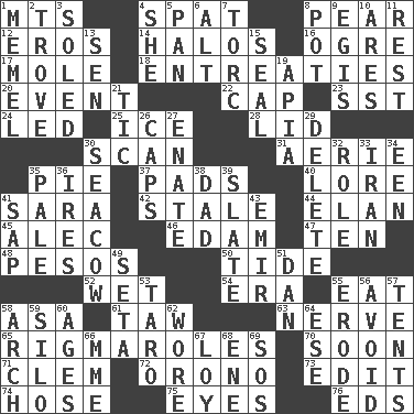 ACROSS 1. Mountains (abbr.) 4. Argument over a trivial matter 8. Lightbulb-shaped fruit 12. Greek god of love 14. Auras 16. Legendary monster 17. Undercover agent 18. Pleas 20. Incident 22. Head covering 23. Fast jet (abbr.) 24. Directed 25. Frozen water 28. Hat (slang) 30. Glance over 31. Nest on high 35. Sliced dessert 37. Writing tablets 40. Old wives' tales, e.g. 41. "Two Mules for Sister ____" 42. Lacking originality or spontaneity 44. Style 45. Actor Baldwin 46. Dutch treat 47. "___ Little Indians" 48. Mexican monetary units 50. Event that recurs at intervals 52. Dripping 54. Period 55. Consume 58. White ___ sheet 61. The 23rd letter of the Hebrew alphabet 63. Boldness 65. Frustrating wastes of time 70. Within a short period 71. Clement's nick name 72. U. of Maine site 73. Prepare for publication 74. Flexible conduit 75. Snake ____ (dice throw) 76. Begley and Asner DOWN 1. Klaipeda city 2. Collection of objects 3. Having a sole or soles 4. A female animal or person 5. Baking dish 6. The first octave above the treble staff 7. Torque (variant) 8. Cooking vessel 9. The front part of a cuirass 10. Ancient Greek god of war 11. Relief 13. Elected rep. 15. Lick closed 19. Capital of Western Samoa 21. Nervous spasm 26. Balmoral and tarboosh 27. Maternal 29. Keyboard key 30. Manatee 32. Hero or heavy, e.g. 33. SW Asia republic 34. Car or cant ending 35. Light colored 36. Angers 38. Male parent 39. Chalkboard 41. Plant excrement 43. Arab leader 49. Bristle 51. Daniel's nick name 53. Pacific island yam 55. Wear away 56. Prevent the occurrence of 57. Portable shelters 58. Bowlike part 59. Grain storage tower 60. Matures 62. Had on 64. Compass dir. 66. Madame (abbr.) 67. Myrna of the movies 68. Compass dir. 69. Mayday