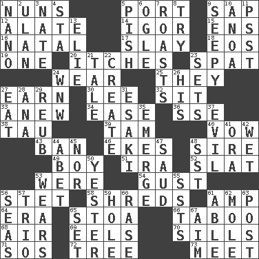 ACROSS 1. Religious women 5. Sweet dark-red dessert wine 9. Plant excrement 12. Having winglike extensions 14. Russian composer Stravinsky 15. Followers of ems 16. Brizilian seaport 17. Kill 18. Greek goddess of the dawn 19. Single 20. Strong, restless desires 23. Petty quarrel 24. Erode 25. Those people 27. Merit 30. Area sheltered from the wind 32. Be seated 33. Afresh 34. Comfort 36. Compass dir. 38. The 19th letter of the Greek alphabet 39. Scottish cap 40. Promise 43. Prohibit 46. Supplements with great effort 48. Title for a man of rank and authority 49. Male child 51. Retirement account (abbr.) 52. Narrow board 53. We are 54. Abrupt rush of wind 56. Proofreading order 58. Fragments 61. Electrical Unit 64. Epoch 65. Portico 66. Off limits 68. Atmosphere 69. Snakelike fish 70. Beverly of Met fame 71. Mayday 72. Relationship diagram 73. Confront DOWN 1. Billionth: prefix 2. Uhlan (variant) 3. Nathan's nickname 4. R.R. building 5. Expression of disdain 6. Stare 7. Cooks with dry heat, as in an oven 8. Attempt to accomplish something 9. Not well drained, as in land 10. Small Philippine buffalo 11. Inconspicuous attention getter 13. Writer Wiesel 21. Falsehood 22. Cause to be 23. Puts into a specified state 24. Compass dir. 26. Part of HMS, perhaps 27. Erode 28. Santa ___, CA 29. Reuben's nickname 31. 1973 Nobel Price Winner (Physics) Leo 35. Develop 37. Morally bad or wrong 41. Mouth or opening 42. Dripping 44. Collude with 45. Not either 47. Saudi Arabian king (1953-1964) 48. Fast jet (abbr.) 50. Last 53. Puts on (as clothing) 55. Fast planes 56. Oceans 57. Musical group of three 59. Hollow 60. To erase 61. Competent 62. Undercover agent 63. Mail 65. Arrange properly for use 67. Direct toward a target or goal