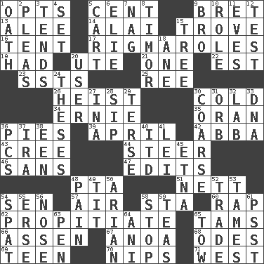 ACROSS 1. Elects 5. Penny 9. Cy Young winner Saberhagen 13. Toward shelter 14. Mountain range southwest of Kyrgyzstan 15. Collection of objects 16. Portable shelter 17. Frustrating wastes of time 19. Possessed 20. Shoshoni 21. Single 22. Eastern Standard Time (abbr.) 23. Fast planes 25. Portuguese money of account (variant) 26. Robbery 30. Chilled 34. Bert's buddy 35. Northwest Algerian city 36. Sliced desserts 39. Showery time 42. Swedish rock group 43. Algonquian 44. Navigate 46. Without 47. Prepares for publication 48. Parent Teacher Assoc. 51. Remaining after all deductions 54. Elected rep. 57. Atmosphere 58. R.R. building 60. Reproach for some lapse or misdeed 62. Conciliate 65. Scottish caps 66. NE Netherlands city 67. Small Philippine buffalo 68. Lyric poems 69. Adolescent 70. Pinches, bites 71. Compass direction DOWN 1. Pledge 2. Entreaties 3. Watches over 4. Put into a specified state 5. Haul 6. Writer Wiesel 7. Tired old horse 8. Southeast Indonesia island 9. Sis' sibling 10. Hero or heavy, e.g. 11. Nights before holidays 12. Trial 15. Woody plant 18. A saturated hydrocarbon 20. One who uses or employs something 24. College papers 27. _ tizzy (2 wds.) 28. Small drink 29. Laconic 30. Unrefined 31. Globe 32. Experiment locale 33. Heredity factor (abbr.) 36. Personal Computers (abbr.) 37. Retirement account (abbr.) 38. Car or cant ending 40. It would 41. Luau accessory 45. Inactive volcano in Sicily 48. Ache 49. Teat (slang) 50. Believer in; advocate of (suffix) 52. Swap 53. Makes less strong or intense 54. Petty quarrel 55. Celtic language 56. Sense of smell 58. Cease 59. Beverages made from leaves 61. Inconspicuous attention getter 63. Fenced enclosure 64. Cuckoo 65. Pull behind
