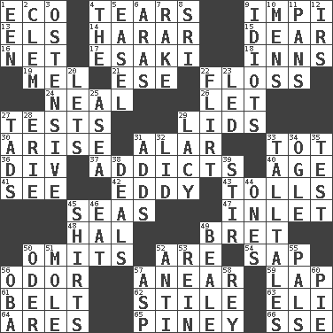 ACROSS 1. Environmental prefix 4. Lacerates 9. Body of Kaffir warriors 13. Raised railways 14. Ethiopian city, capital of Harari 15. Letter starter 16. Fish or hair follower 17. 1973 Nobel Price Winner (Physics) Leo 18. Taverns 19. Cartoonist voice _ Blanc 21. Compass dir. 22. Soft thread for cleaning between teeth 24. Be tempered by heat 26. Allow 27. Trials 29. Flaplike coverings 30. Ascend 31. Having or resembling wings 33. Small child 36. HTML Container Element 37. Inveterate users 40. Grow older 41. Observe 42. Whirlpool 43. For Whom the Bell _____ 45. Oceans 47. An arm off of a larger body of water 48. Actor Linden 49. Cy Young winner Saberhagen 50. Leaves out 52. "We ___ not amused" (Victoria) 54. Plant excrement 56. Scent 57. Approach 59. Pet locale 61. Waist strap 62. Vertical member of a panel or frame 63. Biblical high priest 64. Ancient Greek god of war 65. Abounding in pines 66. Compass dir. DOWN 1. Car or cant ending 2. Clement's nick name 3. Clearly or manifestly demonstrative 4. Definite Article 5. Artist's stand 6. Caspian sea tributary 7. Immoral or dissolute person 8. _ Lanka 9. Foolish or stupid persons 10. Not women's 11. Zero-star reviews 12. Big collection agency 20. Allows 22. Talk or behave amorously 23. Directed 25. At sea 27. Bits 28. 4th largest of the Great Lakes 29. Made of lace 31. Does sums 32. Hat (slang) 33. Baron Munchausen's specialties 34. Stare 35. Trial 38. Allots cards 39. Commotion 44. Washington bills 45. Chest coverings 46. Consume 49. Calif. Air Force Base 50. River in Europe 51. Undercover agent 52. Against 53. It's straight from the horse's mouth 55. Friends 56. Chief or king in Benin or Nigeria 57. Cleo's killer 58. Marina Del _, California 60. Sliced dessert