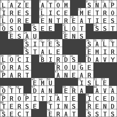 ACROSS 1. Goldbrick 5. Tiny particle 9. Fastener 13. Angers 14. Louse (plural) 15. Paris' subway 16. Old wives' tales, e.g. 17. Pleas 19. Bear (Spanish) 20. Perceive with the eye 21. Car dealer's back yard 22. Fast jet (abbr.) 23. Son of Isaac 25. Followers of ems 26. Locates 30. Table seasoning 34. Showing deterioration from age 35. Arab leader 36. Venues 39. Avian creatures 42. _ Jones' Locker 43. Mouths or openings 44. Makeup applied to the cheeks 46. Role in a play 47. Approach 48. Australian flightless bird 51. Small island 54. Baseball player Mel 57. One of the 12 tribes of Israel 58. Period 60. Actress Gardner 62. Appease 65. On the rocks 66. Laconic 67. Airtight sealed metal containers 68. Tear apart 69. Religious group 70. Part of Q.E.F. 71. Fast planes DOWN 1. _ and Stitch 2. Came up 3. Nothings 4. Compass dir. 5. Toward shelter 6. Prong on a fork 7. Sep. follower 8. Haggard of country music 9. Put into a specified state 10. Nuclear Threat Initiatives 11. Ancient Greek god of war 12. Mail 15. Floor coverings 18. Age 20. Set or collection 24. Help 27. Keyboard key 28. Biblical high priest 29. Spanish missionary in California 30. Spring feasts 31. Nursemaid (var.) 32. 54 in ancient Rome 33. Attempt 36. Chop off 37. Mouth or opening 38. Auto 40. Spanish title 41. Take to court 45. Greek goddess of the earth (variant) 48. Singer Brickell 49. Floor protector 50. Join together 52. Shoestrings 53. Incident 54. Elects 55. Woody plant 56. Torque (variant) 58. Inactive volcano in Sicily 59. Remainder 61. Sums up 63. Pacific Standard Time (abbr.) 64. Wind 65. Big collection agency