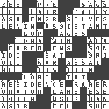 ACROSS 1. Last letter of the English alphabet 4. Before (prefix) 7. Settles 11. Pipe bend 12. Den 13. Chummy 14. White ___ sheet 15. Engineer (abbr.) 16. Finds the solution 17. Soviet premier 1918-24 19. Aide 21. Republican Party 23. Eras 24. Israeli folk dance 25. Acquire through effort 26. Wing 29. Having ears or earlike features 30. Followers of ems 31. Boy, to dad 32. Wedding promise 33. Erode 34. Indian title of respect (Mr.) 35. Petroleum 36. Armed conflict 37. Slender Brazilian palm 40. Born 41. ___ a Wonderful Life 42. Detail 43. Old wives' tales, e.g. 45. Make lace 46. Home 51. More uncommon 55. Speaker 56. Unable to walk 58. Compass dir. 59. Carrier 60. One who uses or employs something 61. Prohibit 62. SW Saudi Arabia district 63. Snakelike fish 64. Institute legal proceedings DOWN 1. Ardor 2. Otherwise 3. Liveliness 4. Baking dish 5. Capital of Latvia 6. Blunders 7. Table seasonings 8. Inventor's middle name 9. Small, secluded valley 10. System (abbr.) 12. Poe poem 13. Introduce or present, as a question 16. Omens 18. Composer Stravinsky 20. Virtuous person 22. Groovy apt. 24. White Person, in Hawaii 25. Erodes 26. Indian state 27. Australian parrot (variant) 28. Black tropical American cuckoo 29. Singer Brickell 32. Electrically charged atom 33. Consumed 36. One who wires 37. Small island 38. A viewer who gazes fixedly 39. Bristle 43. 61 cubic inches 44. Scent 46. Roll call or roster of names 47. Greek god of love 48. Suttee (variant) 49. A slight indication 50. Comfort 52. Confederate soldiers (slang) 53. Son of Isaac 54. French philosopher Descartes 57. Cartoonist voice _ Blanc