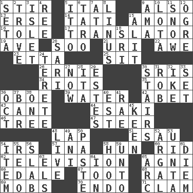 ACROSS 1. Use a swizzle stick 5. Slanted text style (abbr.) 9. In addition 13. Celtic language 14. Jacques of French films 15. Amid 16. Lacquered or enameled metalware 17. Interpreter 19. "___ Maria" 20. "Barney Miller" actor Jack 21. RI univ. 22. Deep reverence 23. Singer James 25. Be seated 26. Bert's buddy 30. Indian titles of respect 34. Disturbances 35. Puff or smoke 36. Mitch Miller's instrument 39. Wetness 42. Collude with 43. Patter 44. 1973 Nobel Price Winner (Physics) Leo 46. Relationship diagram 47. Bull 48. Pet locale 51. He sold his birthright 54. Big collection agency 57. _ tizzy (2 wds.) 58. Attila the _ 60. To free from 62. Household entertainment appliance 65. Hindu god of fire 66. Peak District village in England 67. A blast of a horn 68. Assign a rank or rating to 69. Crowds into 70. Inside; within (prefix) 71. Burrowing marine mollusk DOWN 1. Stalk of a moss capsule 2. Collection of objects 3. Small island 4. Portuguese money of account (variant) 5. "Tell ____ the Marines!" 6. Edible starchy tuberous root 7. _ moment's notice (2 wds.) 8. "_ and Lucy" (Charlie Brown theme song) 9. Wet nurse (var.) 10. Globular water bottle used in Asia 11. Overwhelm 12. Legendary monster 15. Came down and settled, as after flight 18. _ Lanka 20. Indian skirt 24. Cylindrical with tapered ends 27. Immediately 28. Call ___ day 29. _____ Park, CO 30. Flight of steps 31. Director Reiner 32. D.D.E's nickname 33. Arrange properly for use 36. Sep. follower 37. Long, evenly shaped piece 38. Single 40. Eastern Standard Time (abbr.) 41. Actress Charlotte 45. Peachy ____! 48. Not recorded 49. Cuckoo 50. Thick mixture 52. Therefore, facetiously 53. National forest in Provo, Utah 54. Detail 55. Make new 56. Broad, flat, thick piece 58. Parka part 59. To (old English) 61. South Vietnam president (1954) 63. Raised railways 64. Electrically charged atom 65. Curve