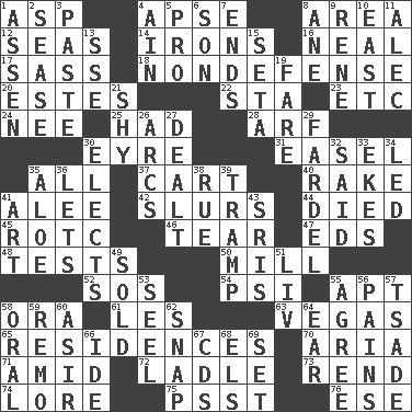ACROSS 1. Cleo's killer 4. Domed church section 8. Type of rug 12. Oceans 14. Metal shackles 16. Anneal 17. Backtalk 18. Unrelated to defense, as in spending 20. _____ Park, CO 22. R.R. building 23. And so on (abbr.) 24. Born 25. Possessed 28. Sandy's bark 30. Jane of fiction 31. Artist's stand 35. 100% 37. Haul 40. Immoral or dissolute person 41. Toward shelter 42. Disparaging remarks 44. Passed on 45. College mil. group 46. Rend 47. Begley and Asner 48. Trials 50. Place where flour is made 52. Distress signal 54. 23rd letter of the Greek alphabet 55. Fitting 58. Mouth or opening 61. French article 63. Viva Las _ 65. Dwellings 70. Operatic vocal solo 71. Among 72. Dipping utensil 73. Tear apart 74. Old wives' tales, e.g. 75. Inconspicuous attention getter 76. Compass dir. DOWN 1. NE Netherlands city 2. Gospel singer Marvin 3. Thick mixture 4. The 18th letter of the Arabic alphabet 5. Adept person 6. Boy, to dad 7. Conclusions 8. One (Scot) 9. French philosopher Descartes 10. 90 degrees 11. Actor Baldwin 13. Compass dir. 15. Stalk of a moss capsule 19. Conductor's collection 21. Like a shrinking violet 26. Arches 27. Started a card game 29. Pack 30. Opts 32. Expressed in words 33. Supplements with great effort 34. Directed 35. _ vera 36. Allows 38. Regret 39. _____ steamer (cargo ship) 41. Tate display 43. Indian titles of respect 49. Exchanged or delivered for money 51. 54 in ancient Rome 53. Stitch closed the eyes of (a falcon) 55. Match 56. Aches 57. Sadhe (variant) 58. Taken by mouth 59. San ____ (Riviera town) 60. SW Saudi Arabia district 62. Fastener 64. Hearing organ 66. Binary compound 67. Music discs 68. Raised railways 69. Arrange properly for use