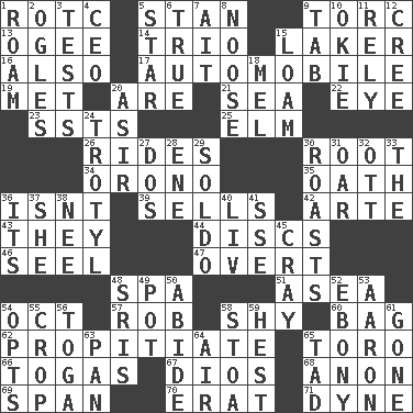ACROSS 1. College mil. group 5. Comedian Laurel of Laurel & Hardy 9. Torque (variant) 13. Double curve, resembling the letter S 14. Musical group of three 15. Member of a famous L.A. basketball team 16. In addition 17. Car 19. Was introduced to 20. "We ___ not amused" (Victoria) 21. Ocean 22. Sight organ 23. Fast planes 25. Shade tree 26. Amusement-park features 30. Carrot, for example 34. U. of Maine site 35. Pledge 36. Is not 39. Makes a sale 42. Johnson of "Laugh-In" 43. Those people 44. Flat circles 46. Sew up the eyelids of hawks and falcons 47. Unconcealed 48. Health resort 51. At sea 54. Sep. follower 57. Director Reiner 58. Like a shrinking violet 60. Paper or plastic container 62. Conciliate 65. "Corrida" creature 66. Ancient Roman robes 67. "Vaya con ____" 68. At once, immediately (arch.) 69. Connect, as a bridge 70. Part of Q.E.F. 71. Centimeter-gram-second unit of force DOWN 1. Wander 2. Stares at amorously 3. Trials 4. Corporate head (abbr.) 5. Play the lead 6. Loyal 7. Small island 8. Trap for birds or small mammals 9. Bar bill 10. Migrant worker of the '30s 11. Have confidence or faith in 12. Algonquian 15. Rich soil 18. Cartoonist voice _ Blanc 20. SW Saudi Arabia district 24. Trinitrotoluene 27. Two (Sp.) 28. Compass dir. 29. Twentieth part of a lira 30. Ridicules or criticizes harshly 31. Boat paddle 32. Baseball player Mel 33. Definite Article 36. ___ a Wonderful Life 37. A female animal or person 38. Born 40. 54 in ancient Rome 41. Compass dir. 45. Supercomputer manufacturer 48. Indian titles of respect 49. Plant holder 50. Tolerate 52. Black 53. Composer Copland 54. Chooses 55. Riding implement 56. Ancient Roman robe 58. Portico 59. Command 61. Went 63. Baking dish 64. Wind 65. Small boy