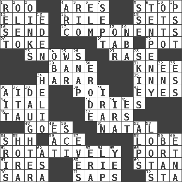 ACROSS 1. Friend of Pooh 4. Ancient Greek god of war 8. Halt 12. Writer Wiesel 14. Cause heat under the collar 15. Puts into a specified state 16. Post 17. Pieces 20. Puff or smoke 21. Keyboard key 22. Cooking vessel 23. Frozen precipitation (plural) 27. Raze (variant) 29. Object of repulsion 31. Leg joint 34. Ethiopian city, capital of Harari 35. Lodging establishments 36. Helper 39. Luau course 41. Snake ____ (dice throw) 42. Slanted text style (abbr.) 43. Frees from moisture 46. "Change" in Tahitian 47. Hearing organs 48. Leaves 51. Brizilian seaport 54. Quiet! 56. Adept person 58. Ear part 61. Happening in regular succession 66. Sweet dark-red dessert wine 67. Angers 68. One of the Great Lakes 69. Comedian Laurel of Laurel & Hardy 70. "Two Mules for Sister ____" 71. Plant excrements 72. R.R. building DOWN 1. State of inaction 2. Butter sub 3. Pig sounds 4. Curve 5. _ de Janeiro 6. Shade tree 7. Back-to-school mo. 8. Compass dir. 9. 3-inch nail 10. "Beetle Bailey" pooch 11. Inconspicuous attention getter 13. Paradise 18. Rowing implement 19. Basketball assoc. 24. Chief or king in Benin or Nigeria 25. Armed conflict 26. Fastener 28. Atmospheres 30. Wear away 32. Compass dir. 33. Curvy letter 34. Sun: prefix 36. Small island 37. Call ___ day 38. Female offspring 40. SW Asia republic 44. Lyricist Gershwin 45. Eastern Standard Time (abbr.) 49. Erode 50. _-fi 52. High mountains 53. Plunders 54. Indian titles of respect 55. Israeli folk dance 57. Nights before holidays 59. Naughty child 60. Inactive volcano in Sicily 62. White ___ sheet 63. Epoch 64. Mouth edge 65. Affirmative reply