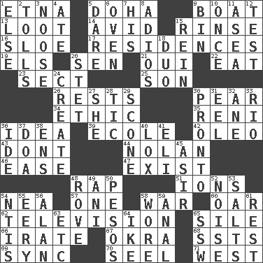 ACROSS 1. Inactive volcano in Sicily 5. Capital of the state of Qatar 9. Water vessel 13. Plunder 14. Enthusiastic 15. Wash lightly 16. _ gin 17. Dwellings 19. Raised railways 20. Elected rep. 21. Fr. "Yes" 22. Ingest 23. Religious group 25. Male offspring 26. Musical pauses 30. Lightbulb-shaped fruit 34. Principle of right and wrong 35. Painter Guido (1575-1642) 36. The main thing one is thinking about 39. Learning spot: Fr. 42. Margarine 43. Do not 44. Pitcher Ryan 46. Comfort 47. Be 48. Hit sharply and swiftly 51. Charged particles 54. Teachers' org. 57. Single 58. Armed conflict 60. Rowing implement 62. Household entertainment appliance 65. Filth; sediment 66. Feeling or showing extreme anger 67. Gumbo ingredient 68. Fast planes 69. Synchronize (abbr.) 70. Stitch closed the eyes of (a falcon) 71. 270 degrees DOWN 1. Otherwise 2. For Whom the Bell _____ 3. Trap for birds or small mammals 4. Had dinner 5. Have the gumption 6. Baking chamber 7. Part of HMS, perhaps 8. Goodbye (Sp.) 9. Storage container 10. Single time 11. At sea 12. Trial 15. It's straight from the horse's mouth 18. Superhero pair 20. Proofreading order 24. Make 27. A female animal or person 28. Nervous spasm 29. Biscuitlike quick bread 30. Right away 31. Snakelike fish 32. A saturated hydrocarbon 33. River (Sp.) 36. Binary compound 37. ___ good deed 38. Followers of ems 40. Brine-cured salmon 41. Biblical high priest 45. SW Saudi Arabia district 48. Be footloose 49. Cuckoo 50. Mexican monetary units 52. Annoying sound 53. Table seasonings 54. Nuclear Threat Initiatives 55. Suggestive of the supernatural 56. ____ Jay Lerner 58. Had on 59. Of or related to the anus 61. Remainder 63. And so on (abbr.) 64. Mamie's mate 65. Compass dir.