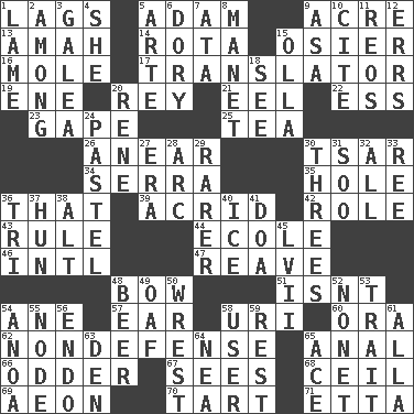 ACROSS 1. Fails to keep up a pace 5. First of billions? 9. Land measure 13. Housemaid 14. Round or rotation of duties 15. Flexible twig of a willow tree 16. Undercover agent 17. Interpreter 19. Compass dir. 20. Marina Del _, California 21. Snakelike fish 22. Curvy letter 23. Yawn 25. Afternoon social gathering 26. Approach 30. Russian ruler of old 34. Spanish missionary in California 35. Opening into or through something 36. Not this but _ 39. Bitter 42. Hero or heavy, e.g. 43. Court order 44. Learning spot: Fr. 46. International (abbr.) 47. Rob, plunder, or pillage 48. Ribbon knot 51. Is not 54. One (Scot) 57. Hearing organ 58. RI univ. 60. Mouth or opening 62. Unrelated to defense, as in spending 65. Of or related to the anus 66. More peculiar 67. Observes 68. To provide with a ceiling 69. A really long time 70. Small pie 71. Singer James DOWN 1. Unable to walk 2. Amid 3. An organ shaped like a helmet 4. A female animal or person 5. Johnson of "Laugh-In" 6. Rowboat 7. _ moment's notice (2 wds.) 8. French painter Edouard 9. White ___ sheet 10. Quote 11. Vintage cars 12. Blunders 15. Rounded earthenware pot or jar 18. Observe 20. French philosopher Descartes 24. Soft color 27. Period 28. Curve 29. Less widely known 30. Triads 31. "Barney Miller" actor Jack 32. 100% 33. Portuguese money of account (variant) 36. Three (prefix) 37. Attila the _ 38. The first octave above the treble staff 40. Frozen water 41. ___ good deed 45. 57 in ancient Rome 48. Fermented drink made from hops 49. Clumsy lout 50. Take or capture by force 52. Music written for nine 53. Distinguishing feature 54. Small Philippine buffalo 55. Thickened enlargement 56. Inside; within (prefix) 58. One who uses or employs something 59. Repose 61. Silent film actress Nazimova 63. Lair 64. Teachers' org. 65. Adept person