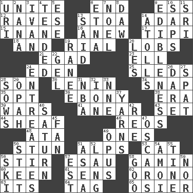 ACROSS 1. Join together 6. Conclude 9. Double-curved letter 12. All-night dance parties 13. Portico 14. The sixth month of the Jewish calendar 15. Lacking in sense or substance 16. Afresh 17. Native american tent (variation) 18. Also 19. Monetary unit of Yemen 20. Tennis shots 21. Mild oath 23. Pipe bend 24. Genesis locale 25. Bobsleighs 28. Manchild 30. Soviet premier 1918-24 34. Fastener 35. Choose 36. Black 38. Epoch 39. Armed conflicts 41. Approach 43. Put into a specified state 44. To gather and bind into a bundle 46. Vintage cars 48. _ moment's notice (2 wds.) 49. Singles 50. Astound 51. High mountains 53. Domesticated feline 56. Commotion 57. Son of Isaac 58. Homeless child 60. Peachy ____! 61. Elected reps. 62. U. of Maine site 63. ___ a Wonderful Life 64. Label 65. Flexible twig of a willow tree DOWN 1. RI univ. 2. Nanny 3. _ the terrible 4. Watched over 5. Compass dir. 6. Inactive volcano in Sicily 7. Christmas carol 8. Obsolete 9. The property of being fit to eat 10. Plant excrements 11. _ Lanka 13. Alleged 14. Ringlike coral islands and reefs 19. Indian princess (variant) 20. French article 22. Set 24. Pleas 26. Have the gumption 27. Petty quarrel 28. Sty mamas 29. Brightly colored fish 31. Basketball assoc. 32. Electrically charged atom 33. Compass dir. 37. Entertaining tales 40. Titan orbits this 42. Portuguese money of account (variant) 45. Avid follower 47. Motion picture awards 49. Musical composition 50. Proofreading order 51. At sea 52. Austrian-born American filmmaker Fritz 54. Mine, in Marseilles 55. Prong on a fork 56. What Jean-Claude Killy likes to do 57. Eastern Standard Time (abbr.) 58. Thick or sticky substance 59. Or not