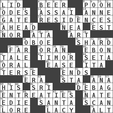 ACROSS 1. Flaplike covering 4. Fermented drink made from hops 8. "Silly old bear" 12. Lyric poems 14. Slender Brazilian palm 16. Queen of England 1702-14 17. Yard entry 18. Homes 20. At or in the front 22. Teachers' org. 23. Eastern Standard Time (abbr.) 24. And not 25. _ moment's notice (2 wds.) 28. Tate display 30. Mitch Miller's instrument 31. Pottery fragment 35. At a great distance 37. Northwest Algerian city 40. Inky black, to poets 41. Story 42. Southeast Indonesia island 44. Stalk of a moss capsule 45. Taken by mouth 46. Relaxation 47. Call ___ day 48. Laconic 50. Conclusions 52. Period 54. R.R. building 55. Santa ___, CA 58. Part of HMS, perhaps 61. Indian title of respect (Mr.) 63. Debunk (Brit. slang) 65. Pleas 70. Nathan's nickname 71. Singer Brickell 72. Before Barbara or Clara 73. Glance over 74. Old wives' tales, e.g. 75. Made of lace 76. The first octave above the treble staff DOWN 1. Utah city north of Ogden 2. Potato state 3. Prevent from occurring 4. Soap unit 5. Compass dir. 6. Double-curved letter 7. Water falling in drops from the sky 8. Baking dish 9. At one time in the past 10. Singles 11. Command 13. Ocean 15. The main thing one is thinking about 19. Hearing organs 21. Small moist lump or mass 26. A blast of a horn 27. Nest on high 29. College paper 30. Threatening words 32. Collude with 33. Round or rotation of duties 34. Heredity factor (abbr.) 35. Conductor's collection 36. Having or resembling wings 38. Nanny (var.) 39. Olfactory organs 41. Small child 43. Monthly bill 49. Celtic language 51. Male parent 53. Ancient river in northeast Turkey 55. Phillipine bananalike plant 56. Relating to or accompanying birth 57. Rep 58. The bottom of a shoe or boot 59. _ china 60. Commotion 62. Slanted text style (abbr.) 64. Followers of ems 66. To separate or throw off 67. _ tizzy (2 wds.) 68. And so on (abbr.) 69. Declare