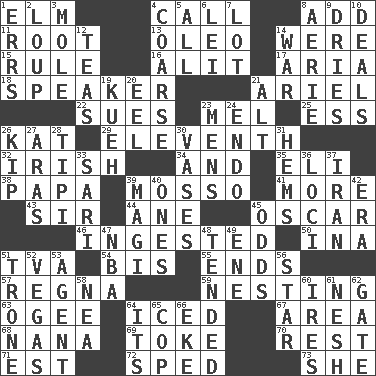 ACROSS 1. Shade tree 4. Give a ring to 8. Increase 11. Carrot, for example 13. Butter sub 14. We are 15. Governing power 16. Set down 17. Operatic vocal solo 18. Orator 21. Satellite of Uranus 22. Institutes legal proceedings 23. Cartoonist voice _ Blanc 25. Double-curved letter 26. Krazy ___ of comics 29. Veterans Day date 32. From or relating to Ireland 34. Added to 35. Biblical high priest 38. Dad 39. With motion or animation 41. Greater amount 43. Title for a knight 44. A saturated hydrocarbon 45. Motion picture award 46. Swallowed 50. _ tizzy (2 wds.) 51. Federal power corp. 54. Again 55. Extremities 57. Canadian anthropologist Darnell 59. Inhabiting a nest 63. Double curve, resembling the letter S 64. On the rocks 67. Type of rug 68. Grandmother 69. Puff or smoke 70. Respite 71. Eastern Standard Time (abbr.) 72. Broke a traffic law 73. A female animal or person DOWN 1. Blunders 2. Central Nebraska county 3. Undercover agent 4. Rough 5. Everything 6. Flowery wreath 7. Car dealer's back yard 8. Nest on high 9. Frees from moisture 10. Allots cards 12. Beverages made from leaves 14. Armed conflict 19. Malaysian steamed pastry 20. Snakelike fish 21. The first octave above the treble staff 23. Not women's 24. Inside; within (prefix) 26. Sleep 27. Ancient river in northeast Turkey 28. Native american tent (variation) 30. Flower holders 31. Is hesitant and indecisive 33. Indian skirt 36. Venues 37. SW Asia republic 39. Wise men 40. Washington bills 42. Epoch 45. Likelihood 47. Basketball assoc. 48. Looked after 49. Compass dir. 51. Heavy duty weighing machine 52. Viva Las _ 53. Representative 56. Play the lead 58. Teachers' org. 60. Angers 61. Tender 62. Yard entry 64. ___ a Wonderful Life 65. Police officer (slang) 66. Make supply last