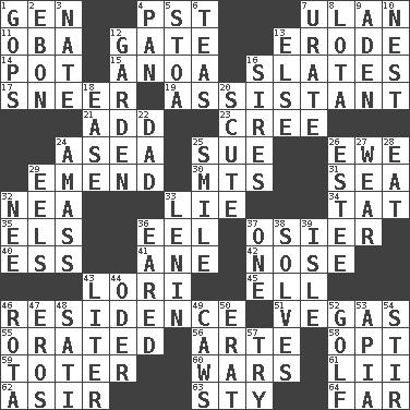 ACROSS 1. Commissioned mil. rank 4. Pacific Standard Time (abbr.) 7. Uhlan (variant) 11. Chief or king in Benin or Nigeria 12. Yard entry 13. Wear away 14. Plant holder 15. Small Philippine buffalo 16. Chalkboards 17. Contemptuous expression 19. Helper 21. Say or write further 23. Algonquian 24. Toward the sea 25. Take to court 26. She-sheep 29. Make improvements or corrections to 30. Mountains (abbr.) 31. Ocean 32. Teachers' org. 33. Whopper 34. Make lace 35. Raised railways 36. Snakelike fish 37. Flexible twig of a willow tree 40. Curvy letter 41. A saturated hydrocarbon 42. Sense of smell 43. Australian parrot (variant) 45. Pipe bend 46. Home 51. Viva Las _ 55. Spoke pompously 56. Johnson of "Laugh-In" 58. Choose 59. Carrier 60. Armed conflicts 61. Cards in a Roman deck? 62. SW Saudi Arabia district 63. Filthy place 64. At a great distance DOWN 1. Republicans 2. Inky black, to poets 3. Nathan's nickname 4. Baking dish 5. Portico 6. Afternoon social gatherings 7. A salt of uric acid 8. Globular water bottle used in Asia 9. An important port of Yemen 10. Egg locale 12. Place where plants grow 13. Otherwise 16. Male parents of animals 18. Comfort 20. Snake scale 22. Male parent 24. Collect or gather 25. Grin 26. First name in cosmetics 27. Put on (as clothing) 28. Erode 29. Snakelike fish 32. Born 33. Soviet premier 1918-24 36. Having ears or earlike features 37. Single 38. Finds the solution 39. Capri or Wight 43. 61 cubic inches 44. River in Europe 46. Roll call or roster of names 47. Greek god of love 48. Suttee (variant) 49. Crow sounds 50. Part of Q.E.F. 52. _ course 53. Capital of Western Samoa 54. Use a swizzle stick 57. Attempt