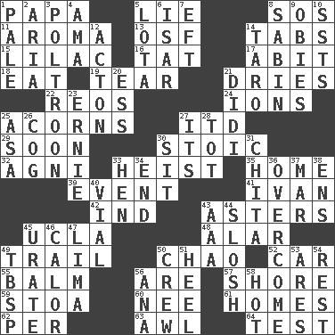 ACROSS 1. Dad 5. Untruth 8. Mayday 11. Scent 13. Order of Saint Francis (abbr.) 14. Bar bills 15. Pale purple color 16. Make lace 17. "This won't hurt ____!" 18. Consume 19. Pull apart 21. Frees from moisture 22. Vintage cars 24. Charged particles 25. Oak nuts 27. It would 29. Within a short period 30. Unemotional 32. Hindu god of fire 33. Robbery 35. Dwelling 39. Happening 41. _ the terrible 42. Working for oneself (abbr.) 43. Michaelmas daisies 45. Southern CA. univ. 48. Having or resembling wings 49. Lag or linger behind 50. US Secretary of Labor Elaine L. _ 52. Automobile 55. Lip ointment 56. "We ___ not amused" (Victoria) 57. Dinah or Pauly 59. Portico 60. Born 61. Dwellings 62. For each 63. Leather borer 64. Trial DOWN 1. Diluted with white 2. Operatic vocal solo 3. Coward 4. Housemaid (var.) 5. Globular water bottle used in Asia 6. Austrian river, tributary to the Danube 7. Bank Draft (abbr.) 8. Unit of acoustic absorption 9. Off-Broadway awards 10. Fast planes 12. 13-14th century defensive garment 14. Edible starchy tuberous root 20. Double-curved letter 21. "You Light Up My Life" star Conn 23. Bert's buddy 25. White ___ sheet 26. Gear tooth 27. It is 28. Small child 30. Be seated 31. Riviera of "Kiss of the Spider Woman" 33. Layer 34. Conclude 36. Conquer 37. Third mo. 38. Followers of ems 40. Small bottle 43. American Automobile Association (abbr.) 44. Splash clumsily 45. A salt of uric acid 46. Bodily heat indicating an inflammation 47. Pale green bean 49. Cook's measure (abbr.) 50. Group working together 51. Person who is morally reprehensible 53. Ancient Greek god of war 54. Remainder 56. Santa ___, CA 58. Being at a high temperature