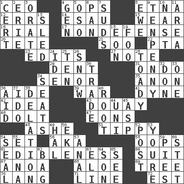 ACROSS 1. Corporate head (abbr.) 4. Republicans 8. Inactive volcano in Sicily 12. Blunders 14. He sold his birthright 15. Erode 16. Monetary unit of Yemen 17. Unrelated to defense, as in spending 20. False hair 21. "Barney Miller" actor Jack 22. Parent Teacher Assoc. 23. Proofreads 27. Brief written record 29. Scratch 31. Southwest Nigerian state 34. Sir (Sp.) 35. At once, immediately (arch.) 36. Helper 39. Armed conflict 41. Unit of force 42. The main thing one is thinking about 43. A city in N France, SE of Calais 46. Dunce 47. Immeasurably long periods of time 48. American tennis player Robert 51. Likely to tip or tilt 54. Arrange properly for use 56. Alias (abbr.) 58. I made a mistake 61. The property of being fit to eat 66. Set or collection 67. Small Philippine buffalo 68. _ vera 69. Relationship diagram 70. Austrian-born American filmmaker Fritz 71. Actor's bit 72. Eastern Standard Time (abbr.) DOWN 1. Certainty 2. One of the Great Lakes 3. Declaim 4. Commissioned mil. rank 5. Bear (Spanish) 6. Baking dish 7. Soap bubbles 8. She-sheep 9. 3-inch nail 10. Political cartoonist Thomas 11. Type of rug 13. Downhill vehicle 18. Age 19. Egg _ yung 24. Binary compound 25. Nine, plus one 26. Frozen precipitation 28. Sycophant 30. Buy and sell 32. Spanish title 33. Single 34. Theater features 36. Assist 37. Wedding promise 38. Conveyance 40. Carrot, for example 44. University (slang) 45. Viper 49. Actor Linden 50. Supplement with great effort 52. Mail 53. You are 54. Lick closed 55. Pulitzer Prize-winning author Ferber 57. Of or related to the anus 59. Sliced desserts 60. Proofreading order 62. Container for groceries 63. Connecticut Ivy Leaguer 64. Boy, to dad 65. Perceive with the eye