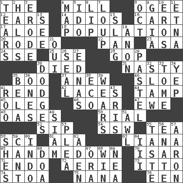 ACROSS 1. Definite Article 4. Place where flour is made 8. Double curve, resembling the letter S 12. Hearing organs 14. Goodbye (Sp.) 16. Haul 17. Medicinal plant 18. Census information 20. Cowboy competition 22. Baking dish 23. White ___ sheet 24. Compass dir. 25. Purpose 28. Republican Party 30. Passed on 31. Difficult 35. Sometimes accompanies a hiss 37. Afresh 40. _ gin 41. Tear apart 42. Shoestrings 44. Pack (down) 45. Cassini of fashion 46. Fly high 47. She-sheep 48. Fertile tracts in a desert 50. Monetary unit of Yemen 52. Small drink 54. Compass dir. 55. Afternoon social gathering 58. _-fi 61. In the manner of 63. Climbing, woody, usually tropical vines 65. Sleeping bag shop? 70. Austrian river, tributary to the Danube 71. Inside; within (prefix) 72. Nest on high 73. "Tell ____ the Marines!" 74. Portico 75. Grandmother 76. Car or cant ending DOWN 1. Pulls into pieces 2. Rings 3. Eat (away) 4. Atlas unit 5. Wedding promise 6. Mouth edge 7. Central Nebraska county 8. Sep. follower 9. Greek goddess of the earth (variant) 10. Greek god of love 11. Inactive volcano in Sicily 13. Observe 15. Volcanic refuse 19. At once, immediately (arch.) 21. Fr. "Yes" 26. Lick closed 27. Ferber et al. 29. Soft color 30. Evades 32. Cole _ (cabbage dish) 33. Heavy book 34. Slangy assent 35. Actor Lugosi 36. Singles 38. Environmental prefix 39. Puts on (as clothing) 41. Friend of Pooh 43. Indian titles of respect 49. Thailand, formerly 51. Leather borer 53. Entreaty 55. Clothes sense 56. Related on the mother's side 57. Composer Copland 58. "______ My Girl" (Turtles hit) 59. Patter 60. Southeast Asian peninsula 62. Arabian gulf 64. One more than two 66. ___ good deed 67. Mouth or opening 68. Acquire through effort 69. Teachers' org.
