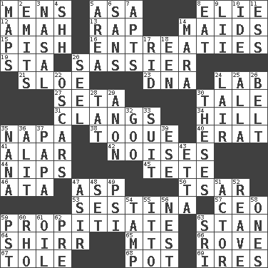 ACROSS 1. Not women's 5. White ___ sheet 8. Writer Wiesel 12. Wet nurse 13. Strike 14. Unmarried girls 15. Expression of disdain 16. Pleas 19. R.R. building 20. More lively and spirited 21. A type of plum 23. Heredity factor (abbr.) 24. Experiment locale 27. Bristle 30. Story 31. Gives out a loud, resonant sound 34. Land elevation 35. California wine valley 38. Woman's close-fitting hat 40. Part of Q.E.F. 41. Having or resembling wings 42. Annoying sounds 44. Cuts off 45. Wig 46. "One Day ___ Time" 47. Cleo's killer 50. Russian ruler of old 53. French poetic form 57. Corporate head (abbr.) 59. Appease 63. Comedian Laurel of Laurel & Hardy 64. Bake eggs in their shells 65. Mountains (abbr.) 66. Be footloose 67. Lacquered or enameled metalware 68. Plant holder 69. Angers DOWN 1. Atlas contents 2. Gives off 3. Rhinal 4. Quiet! 5. Length times width 6. Without 7. Flats, for short 8. Erode 9. Cards in a Roman deck? 10. Binary compound 11. Curvy letter 14. Hindu Mythology: god of death 17. To free from 18. Car or cant ending 20. Stitch closed the eyes of (a falcon) 22. Motion picture awards 24. Den 25. Silent film actress Nazimova 26. Waist strap 28. Make lace 29. Soon (poet.) 30. College papers 32. Thick or sticky substance 33. Set or collection 35. Nanny 36. Set down 37. Dad 39. Compass dir. 43. Singer James 47. SW Saudi Arabia district 48. Put into a specified state 49. 23rd letter of the Greek alphabet 51. Thespian 52. Break or tear apart 54. Pack (down) 55. "Tell ____ the Marines!" 56. Egg locale 58. Singles 59. Pacific Standard Time (abbr.) 60. 17th letter of the Greek alphabet 61. Petroleum 62. Before (prefix) 63. _ Lanka