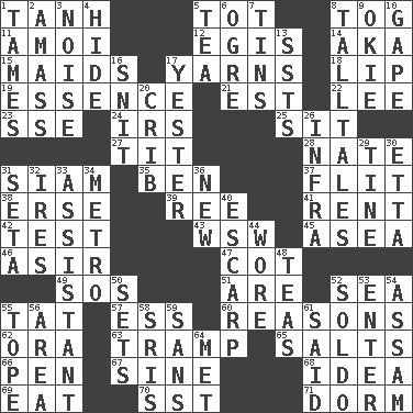 ACROSS 1. Hyperbolic tangent 5. Small child 8. Coat; cloak 11. Mine, in Marseilles 12. Armor plate that protects the chest 14. Alias (abbr.) 15. Women servants 17. Entertaining tales 18. Mouth edge 19. Center 21. Eastern Standard Time (abbr.) 22. Area sheltered from the wind 23. Compass dir. 24. Big collection agency 25. Be seated 27. Teat (slang) 28. Nathan's nickname 31. Thailand, formerly 35. Benjamin's nick name 37. Sudden quick movement 38. Celtic language 39. To sift 41. Monthly bill 42. Trial 43. Compass dir. 45. Toward the sea 46. SW Saudi Arabia district 47. Small bed 49. Distress signal 51. "We ___ not amused" (Victoria) 52. Ocean 55. Make lace 57. Curvy letter 60. Thinks logically 62. Mouth or opening 63. _____ steamer (cargo ship) 65. Table seasonings 66. Fenced enclosure 67. Trig term 68. It may be bright or harebrained 69. Ingest 70. Fast jet (abbr.) 71. Dormintory (informal) DOWN 1. Makes less strong or intense 2. Collect or gather 3. Annoying sound 4. Flintstone garb 5. Afternoon social gathering 6. Legendary monster 7. Airtight sealed metal containers 8. Baron Munchausen's specialties 9. Migrant worker of the '30s 10. Stare wonderingly 13. Fast planes 16. In a ____ (agitated or irritated) 17. Next before 20. Baby bed with high sides 26. Kind of red light 29. Prong on a fork 30. Singer James 31. Bristle 32. Angers 33. Helper 34. Paris' subway 36. ___ Haven, CT 40. Fortification 44. Had on 48. Afternoon social gatherings 50. Arranges properly for use 52. Twentieth part of a lira 53. Keyboard key 54. Indian state 55. Drink excessively 56. Length times width 58. Indian titles of respect 59. Without 61. Stated 64. Was introduced to