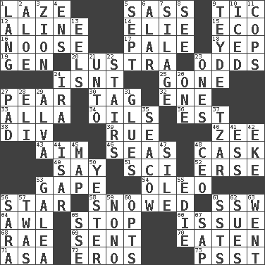 ACROSS 1. Goldbrick 5. Backtalk 9. Nervous spasm 12. Place in a line 14. Writer Wiesel 15. Environmental prefix 16. Trap for birds or small mammals 17. Diluted with white 18. Slangy assent 19. Commissioned mil. rank 20. A period of five years 23. Likelihood 24. Is not 25. Went 27. Lightbulb-shaped fruit 30. Label 32. Compass dir. 33. Silent film actress Nazimova 34. Petroleums 36. Eastern Standard Time (abbr.) 38. HTML Container Element 39. Sorrow 40. Last letter of the English alphabet 43. Direct toward a target or goal 46. Oceans 48. Keg 49. Declare 51. _-fi 52. Celtic language 53. Stare wonderingly 54. Margarine 56. Play the lead 58. Overwhelmed 61. Compass dir. 64. Leather borer 65. Discontinue 66. Come out of 68. Actress Charlotte 69. Transmitted 70. Consumed 71. White ___ sheet 72. Greek god of love 73. Inconspicuous attention getter DOWN 1. Long (Scottish) 2. Medicinal plant 3. The Jewish people; Israel 4. Followers of ems 5. Back-to-school mo. 6. Having or resembling wings 7. Fodder prepared in a silo 8. Observe 9. Miss Universe 1986, Barbara Palacios _ 10. On the rocks 11. 911 reaches them 13. Snakelike fish 21. To (old English) 22. Flight of steps 23. Singles 24. Retirement account (abbr.) 26. Single 27. Groovy apt. 28. Biblical high priest 29. Inventor's middle name 31. Cements 35. Manatee 37. Russian ruler 41. Double-curved letter 42. Supplement with great effort 44. Austrian river, tributary to the Danube 45. Atlas unit 47. Drop; flow; fall 48. Corporate head (abbr.) 50. Of or pertaining to yesterday 53. An organ shaped like a helmet 55. Singer Brickell 56. "Two Mules for Sister ____" 57. It was, poetically 59. Words to Nanette 60. Chooses 61. Fast planes 62. Institutes legal proceedings 63. Left 65. Compass dir. 67. Plant excrement