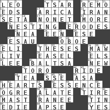 ACROSS 1. Lion 4. Russian ruler of old 8. San ____ (Riviera town) 12. Begley and Asner 13. N. Chile seaport 14. SW Asia republic 15. Bristle 17. Music written for nine 18. Greater amount 19. Snuggling 21. Eats (away) 23. Teachers' org. 24. Car or cant ending 26. Compass dir. 27. Son of Isaac 28. Mitch Miller's instrument 30. Biblical high priest 31. College papers 34. Opening into something insatiable 37. 54 in ancient Rome 38. Artist's stand 39. Raised railways 40. Area sheltered from the wind 41. Greek mezzo-soprano Agnes 42. ___ Haven, CT 43. "Corrida" creature 44. Travel on an animal 46. Afternoon social gathering 47. Compass dir. 50. White ___ sheet 51. Centers 54. Core 57. Legendary monster 58. Having winglike extensions 60. Become fatigued 62. Vertical spar for supporting sails 63. Indian princess (variant) 64. Metal container 65. Singer Brickell 66. Domed church section 67. Affirmative reply DOWN 1. French article 2. Genesis locale 3. Clearly or manifestly demonstrative 4. Heavy duty weighing machine 5. Scorch 6. Adept person 7. Pace 8. Full of chinks, cracks, or crevices 9. Wear away 10. Female horse 11. Washington bills 13. Black tropical American cuckoo 16. Toward the sea 20. The 19th letter of the Greek alphabet 22. Vintage cars 25. Olfactory organs 27. Writer Wiesel 29. Actor Lugosi 30. Pipe bend 31. Separate forcefully 32. Radiant circles of light 33. Eastern Standard Time (abbr.) 34. Ananias' fault 35. Toward shelter 36. Compass dir. 41. Water vessel 43. Cylindrical with tapered ends 44. Actress Charlotte 45. Is not 46. Tarsus (plural) 48. Seines 49. First name in cosmetics 51. Residence 52. Mild oath 53. "Two Mules for Sister ____" 55. Perceive with the eye 56. 4th largest of the Great Lakes 59. Pet locale 61. Followers of ems
