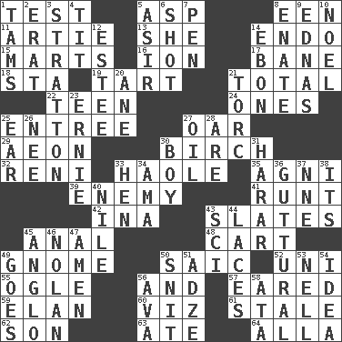 ACROSS 1. Trial 5. Viper 8. Car or cant ending 11. Nick name for Arthur 13. A female animal or person 14. Inside; within (prefix) 15. Shops 16. Electrically charged atom 17. Object of repulsion 18. R.R. building 19. Small pie 21. Add up to 22. Adolescent 24. Singles 25. Main course 27. Rowing implement 29. Age 30. A tree used for making furniture 32. Painter Guido (1575-1642) 33. White Person, in Hawaii 35. Hindu god of fire 39. Foe 41. Undersized animal 42. _ tizzy (2 wds.) 43. Chalkboards 45. Of or related to the anus 48. Heavy open wagon 49. Dwarf 50. Ketch in the Levant 52. Corn or form start 55. Stare 56. Added to 57. Having ears or earlike features 59. Liveliness 60. Namely 61. Having lost freshness 62. Male offspring 63. Had dinner 64. Silent film actress Nazimova DOWN 1. Scottish caps 2. Part of Q.E.F. 3. Ski resort town in Vermont 4. Teat (slang) 5. SW Saudi Arabia district 6. Attempt 7. Writing instrument 8. Maternal 9. Ferber et al. 10. Christmas carol 12. First name in cosmetics 14. Inky black, to poets 20. A saturated hydrocarbon 21. Torque (variant) 23. Bert's buddy 25. Hearing organ 26. Born 27. Lubricate 28. "We ___ not amused" (Victoria) 30. Male child 31. Ethiopian city, capital of Harari 33. Layer 34. Nanny (var.) 36. From the throat 37. Compass dir. 38. ___ a Wonderful Life 40. "Death on the ____" 43. _-fi 44. Shoestrings 45. White American of non-Hispanic descent 46. Pitcher Ryan 47. So be it 49. Moves 50. In a ____ (agitated or irritated) 51. Edge tool used to cut and shape wood 53. 1994 drama film starring Jodie Foster 54. It may be bright or harebrained 56. Actress Gardner 58. _ moment's notice (2 wds.)