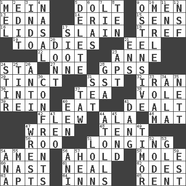 ACROSS 1. Count _ (2 wds.) 5. Dunce 9. Presage 13. Pulitzer Prize-winning author Ferber 14. 4th largest of the Great Lakes 15. Elected reps. 16. Hats (slang) 17. Killed 18. Not kosher 19. Sycophants 21. Snakelike fish 22. Plunder 23. Singer Murray 24. R.R. building 27. Compass dir. 28. Global Positioning Systems (abbr.) 29. Tinged 31. Fast jet (abbr.) 32. SW Asia republic 36. To the inside or interior of 37. Beverage made from leaves 38. Short-tailed, large-bodied rat 39. It's straight from the horse's mouth 40. Erode 41. Started a card game 42. Soared 44. According to 46. Floor covering 47. Songbird 48. Portable shelter 50. Friend of Pooh 51. Yearning 54. So be it 56. Hold, grip (Informal) 58. Undercover agent 60. Political cartoonist Thomas 61. Be tempered by heat 62. Lyric poems 63. Tenement units (abbr.) 64. Restaurants 65. Monthly bill DOWN 1. Cartoonist voice _ Blanc 2. Prepare for publication 3. Southeast Asian peninsula 4. Relating to the nose 5. Keyboard key 6. Mouths or openings 7. Cards in a Roman deck? 8. Nine, plus one 9. Clearly or manifestly demonstrative 10. Haggard of country music 11. Compass dir. 12. Overdraft (abbr.) 17. The Jewish people; Israel 20. Do not 21. Followers of ems 23. Fitting 24. Tumult 25. Prong on a fork 26. Against 28. Girls' org. (abbr.) 30. Meets 31. Arrange properly for use 33. Wander aimlessly 34. Silent film actress Nazimova 35. Remaining after all deductions 37. The 23rd letter of the Hebrew alphabet 40. Car or cant ending 41. Mild oath, euphamism for damn 43. Lion 44. Ringlike coral islands and reefs 45. Grant temporary use of 47. Take or capture by force 49. The easternmost of the Lesser Sundas 51. Grant temporary use of 52. Connecting point 53. Small, secluded valley 54. Santa ___, CA 55. Atlas unit 56. Cuckoo 57. Layer 59. Eastern Standard Time (abbr.)