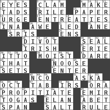 ACROSS 1. Snake ____ (dice throw) 5. Dollar (slang) 9. Create 13. Bits 14. Cause heat under the collar 15. Some stationery 16. Goad 17. Pleas 19. _ tizzy (2 wds.) 20. Deep reverence 21. Directed 22. A saturated hydrocarbon 23. Indian titles of respect 25. Followers of ems 26. A piece of turf (Scot.) 30. Lick closed 34. From or relating to Ireland 35. One of the Great Lakes 36. "Tell ____ the Marines!" 39. Wet 42. Have the gumption 43. Not this but _ 44. Trap for birds or small mammals 46. Arranges properly for use 47. Keyboard key 48. Non-commissioned officer (abbr.) 51. "____ silly question..." 54. Sep. follower 57. Bar bill 58. Big collection agency 60. Mouth or opening 62. Appease 65. Arab leader 66. Ancient Roman robes 67. Flair 68. Collude with 69. Connect, as a bridge 70. Table seasoning 71. Court order DOWN 1. Needle case 2. Entertaining tales 3. _ Allan Poe 4. Compass dir. 5. Ship's personnel 6. Actor's bit 7. The first octave above the treble staff 8. Haggard of country music 9. Floor covering 10. Capital of Western Samoa 11. Peachy ____! 12. Celtic language 15. Groovy apts. 18. Car or cant ending 20. SW Saudi Arabia district 24. Foolish or stupid persons 27. Zeal 28. Bear (Spanish) 29. One or ones belonging to thee 30. Spring feasts 31. Epoch 32. Atmosphere 33. Area sheltered from the wind 36. It is 37. Definite Article 38. Make lace 40. Boy, to dad 41. Small child 45. Oceans 48. Nuclear Threat Initiatives 49. Feline 50. Off-Broadway awards 52. Dried seaweed eaten as food 53. Satellite of Uranus 54. Elects 55. Riding implement 56. Ancient Roman robe 58. Slanted text style (abbr.) 59. Monthly bill 61. Johnson of "Laugh-In" 63. Baking dish 64. Chicken ___ king 65. Ewer handle