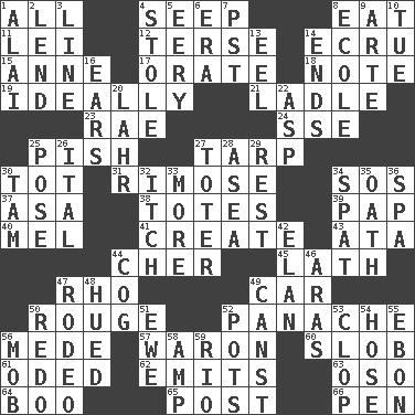 ACROSS 1. Everything 4. Ooze 8. Consume 11. Flowery wreath 12. Laconic 14. Shade of tan 15. Singer Murray 17. Speak pompously 18. Musical sound 19. Under perfect conditions 21. Dipping utensil 23. Actress Charlotte 24. Compass dir. 25. Expression of disdain 27. Canvas cover 30. Small child 31. Full of chinks, cracks, or crevices 34. Mayday 37. White ___ sheet 38. Hauls 39. Infant food 40. Cartoonist voice _ Blanc 41. Make 43. _ moment's notice (2 wds.) 44. "Mermaids" star 45. Thin strip of wood or metal 47. 17th letter of the Greek alphabet 49. 4-wheeled motor vehicle 50. Makeup applied to the cheeks 52. Flamboyance 56. Ancient Persian 57. Make _____ (do battle with) 60. Messy guy 61. Wrote a lyric poem 62. Gives off 63. Bear (Spanish) 64. Oct. 31 cry 65. Mail 66. Writing instrument DOWN 1. Jai ____ 2. Grant temporary use of 3. Actor's bit 4. Took without asking 5. Suggestive of the supernatural 6. Period 7. Pacific Standard Time (abbr.) 8. Learning spot: Fr. 9. Johnson of "Laugh-In" 10. Third day of the wk. 13. Snakelike fish 14. Conclusions 16. Hearing organs 20. Cowardly lion portrayer 22. Viper 25. Airs 26. Slanted text style (abbr.) 27. Carrier 28. At sea 29. Remainder 30. Scottish cap 32. Hankering 33. Greater amount 34. Petty quarrel 35. Pledge 36. Health resort 42. Flair 44. Gear tooth 46. Ancient river in northeast Turkey 47. Cowboy competition 48. Became colored 49. 2nd pers. sing. pres. of can (arch.) 50. Redecorate 51. She-sheep 52. Plant holders 53. Hoof sound 54. Flexible conduit 55. Inky black, to poets 56. Crowd into 58. Electrical Unit 59. River (Sp.)