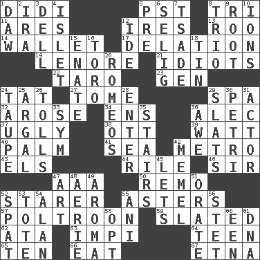 ACROSS 1. "You Light Up My Life" star Conn 5. Pacific Standard Time (abbr.) 8. Three (prefix) 11. Ancient Greek god of war 12. Angers 13. Friend of Pooh 14. Place for singles 17. Accusation by an informer 19. Poe poem 21. Foolish or stupid persons 22. Edible starchy tuberous root 23. Commissioned military rank (abbr.) 24. Make lace 27. Heavy book 29. Health resort 32. Came up 34. Followers of ems 36. Actor Baldwin 37. Unsightly 38. Baseball player Mel 39. Electrical Unit 40. Inside of hand 41. Ocean 42. Paris' subway 43. Raised railways 44. Cause heat under the collar 46. Title for a knight 47. Auto club (abbr.) 50. San ____ (Riviera town) 52. A viewer who gazes fixedly 55. Michaelmas daisies 57. Characterized by complete cowardliness 59. Scheduled 62. _ moment's notice (2 wds.) 63. Body of Kaffir warriors 64. Adolescent 65. Nine, plus one 66. Erode 67. Inactive volcano in Sicily DOWN 1. Simpleton 2. Lyricist Gershwin 3. Small valley 4. Small island 5. Before (prefix) 6. Former Milwaukee Brewers owner Bud 7. Sadhe (variant) 8. Musical group of three 9. Carrot, for example 10. Charged atoms 12. Binary compound 15. Related on the mother's side 16. "Corrida" creature 18. Shallow baking pan 20. Lover boys 24. Grayish beige 25. Therefore, facetiously 26. For Whom the Bell _____ 28. Keyboard key 29. Narrow boards 30. _ dish (used to culture cells) 31. Thespian 33. Symbol (abbr.) 35. Flight of steps 36. Deep reverence 42. Klaipeda city 45. Allows 47. Nonscientific branch of learning 48. Nest on high 49. Odor 51. Declaim 52. Petty quarrel 53. Haul 54. Actor Alda or Thicke 55. Cuckoo 56. Proofreading order 58. Elect 60. Car or cant ending 61. Heredity factor (abbr.)