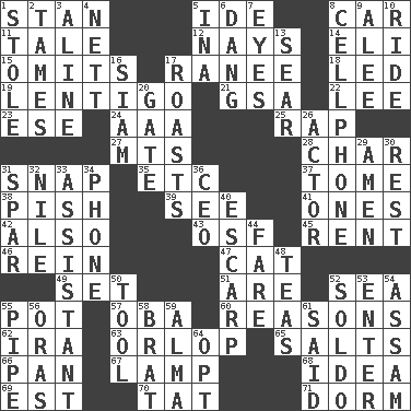 ACROSS 1. Comedian Laurel of Laurel & Hardy 5. Binary compound 8. Automobile 11. Falsehood 12. Negative votes 14. Biblical high priest 15. Leaves out 17. The wife of a rajah (variant) 18. Directed 19. Small, flat, pigmented spot on the skin 21. Girls' org. (abbr.) 22. Area sheltered from the wind 23. Compass dir. 24. American Automobile Association (abbr.) 25. Strike 27. Mountains (abbr.) 28. Burn to charcoal 31. Fastener 35. And so on (abbr.) 37. Heavy book 38. Expression of disdain 39. Observe 41. Washington bills 42. In addition 43. Order of Saint Francis (abbr.) 45. Monthly bill 46. It's straight from the horse's mouth 47. Feline 49. Arrange properly for use 51. "We ___ not amused" (Victoria) 52. Ocean 55. Plant holder 57. Chief or king in Benin or Nigeria 60. Thinks logically 62. Lyricist Gershwin 63. Lowest deck of a ship 65. Table seasonings 66. Baking dish 67. Desk light 68. The content of cognition 69. Eastern Standard Time (abbr.) 70. Make lace 71. Dormintory (informal) DOWN 1. Fur scarf 2. Softens 3. Place in a line 4. Remaining after all deductions 5. _ tizzy (2 wds.) 6. Mild oath, euphamism for damn 7. Sight organs 8. Portable communications device 9. Toward shelter 10. Travel on an animal 13. Dry up 16. Thailand, formerly 17. Ridicules or criticizes harshly 20. Yard entry 26. Thespian 29. So be it 30. Remainder 31. Coast Guard woman 32. "Death on the ____" 33. Helper 34. Give a jingle 36. Corporate head (abbr.) 40. Fortification 44. Conductor's collection 48. Afternoon social gatherings 50. Instrument 52. Twentieth part of a lira 53. Keyboard key 54. Indian state 55. Corncob 56. Mouths or openings 58. Naughty child 59. _ mater 61. Stated 64. Choose