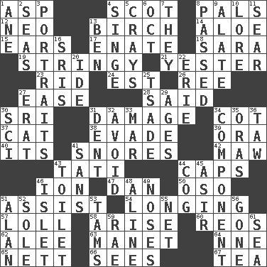 ACROSS 1. Viper 4. Highlander 8. Friends 12. Modern: prefix 13. A tree used for making furniture 14. Medicinal plant 15. Hearing organs 17. Maternal 18. "Two Mules for Sister ____" 19. Slender, wiry 21. Last 23. To free from 24. Eastern Standard Time (abbr.) 26. To separate or throw off 27. Comfort 28. Expressed in words 30. Indian title of respect (Mr.) 31. Break 34. Small bed 37. Feline 38. Elude 39. Mouth or opening 40. ___ a Wonderful Life 41. Sounds asleep 42. Informal term for the mouth 43. Jacques of French films 44. Smile enhancers 46. Electrically charged atom 47. Daniel's nick name 50. Bear (Spanish) 51. Help 54. Yearning 57. Hang loosely or laxly 58. Get up 60. Vintage cars 62. Toward shelter 63. French painter Edouard 64. Compass dir. 65. Remaining after all deductions 66. Perceives with the eye 67. Beverage made from leaves DOWN 1. One (Scot) 2. Oceans 3. Likenesses of persons 4. Burn superficially 5. Trading vessels 6. Sep. follower 7. Those things 8. Went by 9. Having winglike extensions 10. Old wives' tales, e.g. 11. Singe 13. Benjamin's nick name 16. Indian titles of respect 20. Binary compound 22. 4th largest of the Great Lakes 25. Sadhe (variant) 27. Part of Q.E.F. 29. Matures 30. _-fi 31. Scratch 32. Prevent the occurrence of 33. Impair 34. Piece 35. Mouths or openings 36. The 23rd letter of the Hebrew alphabet 41. Without 43. Bathroom plumbing fixture 44. Gear tooth 45. SW Saudi Arabia district 46. Small island 48. Place in a line 49. Olfactory organs 51. ____ Jay Lerner 52. Flatfish 53. Scottish caps 55. Fish or hair follower 56. Went 59. Actress Charlotte 61. Ocean