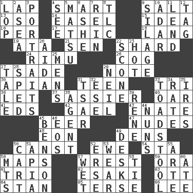 ACROSS 1. Infant locale 4. Don Adams' spy role 9. Table seasoning 13. Bear (Spanish) 14. Artist's stand 15. The content of cognition 16. For each 17. Moral principle 18. Long (Scottish) 19. "One Day ___ Time" 21. Elected rep. 22. Broken piece 24. Tall New Zealand timber tree 26. Gear tooth 27. Sadhe (variant) 29. Musical sound 30. Bee-related 31. Adolescent 33. Three (prefix) 36. Allow 37. More impudent 40. Rowing implement 41. Begley and Asner 42. Highlander 43. Maternal 45. Fermented drink made from hops 47. Unclothed pictures 48. A really long time 49. Cub Scout units 50. 2nd pers. sing. pres. of can (arch.) 52. She-sheep 54. R.R. building 56. Atlas contents 57. Obtain by seizing forcibly or violently 59. Mouth or opening 61. Musical group of three 62. 1973 Nobel Price Winner (Physics) Leo 63. Baseball player Mel 64. Comedian Laurel of Laurel & Hardy 65. Laconic 66. Area sheltered from the wind DOWN 1. Chop off 2. Toward the sea 3. Likenesses of persons 4. Perceive with the eye 5. Taiwanese island in East China Sea 6. American tennis player Robert 7. It's straight from the horse's mouth 8. Affectionate concern, for short 9. Fodder prepared in a silo 10. The sixth month of the Jewish calendar 11. Grant temporary use of 12. Label 20. Opera by Verdi 22. Biscuitlike quick bread 23. Being at a high temperature 25. Not women's 27. Story 28. Drove too fast 29. Famous astronaut Armstrong 31. Russian ruler of old 32. Compass dir. 33. Inedible or poisonous agaric 34. Assign a rank or rating to 35. Angers 38. Rep 39. French philosopher Descartes 44. Religious women 45. Gillaume's butler role 46. Greek goddess of the dawn 49. Writing tables 50. Draw slowly or heavily 51. Capital of Western Samoa 52. Celtic language 53. Erode 55. Johnson of "Laugh-In" 56. Mountains (abbr.) 57. Dripping 58. Neckwear 60. Had dinner