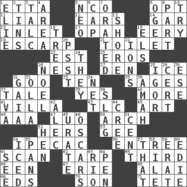 ACROSS 1. Singer James 5. Non-commissioned officer (abbr.) 8. Choose 11. One who doesn't tell the truth 12. Hearing organs 14. Slender fish 15. An arm off of a larger body of water 17. Brightly colored fish 18. Suggestive of the supernatural 19. Fortification 21. Bathroom 23. Eastern Standard Time (abbr.) 25. Greek god of love 26. Delicate 27. Lair 28. Frozen water 31. Thick or sticky substance 33. "___ Little Indians" 35. Gurus 37. Falsehood 38. It is so 40. Greater amount 41. Country estate 43. Affectionate concern, for short 45. Nonscientific branch of learning 46. Auto club (abbr.) 47. Nilotic language 50. Bowlike part 52. Possessive pronoun 53. Unit of force equal to gravity 54. Medicinal drug used to evoke vomiting 56. Main course 61. Skim 62. Canvas cover 65. One of three equal parts 66. Car or cant ending 67. 4th largest of the Great Lakes 68. Mountain range southwest of Kyrgyzstan 69. Begley and Asner 70. Male child 71. Wig DOWN 1. Writer Wiesel 2. Airtight sealed metal containers 3. Baby powder 4. Length times width 5. Modern: prefix 6. Head covering 7. Declaimed 8. Double curve, resembling the letter S 9. Component 10. Attempt 13. Dinah or Pauly 16. Family _ (genealogy) 18. Raised railways 20. Inconspicuous attention getter 22. Charged atoms 24. Those things 26. Christmas carol 28. Russian composer Stravinsky 29. Certainty 30. Compass dir. 31. Greek goddess of the earth (variant) 32. Water jar 34. Fish or hair follower 36. Housemaid 37. Federal power corp. 39. Volcanic refuse 42. Actor Baldwin 44. Algonquian 48. A salt of uric acid 49. Motion picture awards 51. Penny 52. Layer 54. On the rocks 55. Zero-star reviews 57. Not this but _ 58. Cause heat under the collar 59. Part of Q.E.F. 60. Singer Brickell 61. Observe 63. River (Sp.) 64. Animal enclosure