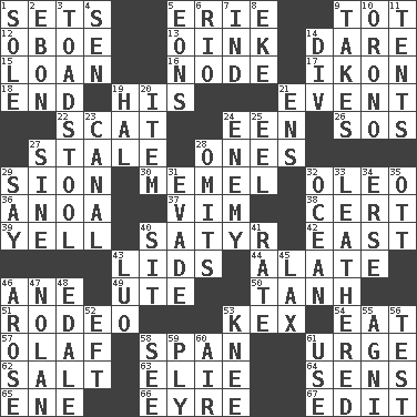 ACROSS 1. Arranges properly for use 5. One of the Great Lakes 9. Small child 12. Mitch Miller's instrument 13. Pig sound 14. Have the gumption 15. Grant temporary use of 16. Thickened enlargement 17. Image 18. Conclude 19. Part of HMS, perhaps 21. Incident 22. Get outta here! 24. Car or cant ending 26. Mayday 27. Lacking originality or spontaneity 28. Singles 29. The Jewish people; Israel 30. Klaipeda city 32. Margarine 36. Small Philippine buffalo 37. Zeal 38. Certainty 39. Shout 40. Man with strong sexual desires 42. 90 degrees 43. Hats (slang) 44. Having winglike extensions 46. One (Scot) 49. Shoshoni 50. Hyperbolic tangent 51. Cowboy competition 53. A weed 54. Ingest 57. Norwegian king 58. Connect, as a bridge 61. Goad 62. Table seasoning 63. Writer Wiesel 64. Elected reps. 65. Compass dir. 66. Jane of fiction 67. Prepare for publication DOWN 1. Flatfish 2. Inky black, to poets 3. Inedible or poisonous agaric 4. Elected rep. 5. Immeasurably long periods of time 6. _ de Janeiro 7. Working for oneself (abbr.) 8. Supplement with great effort 9. Receives possession of 10. U. of Maine site 11. Portable shelters 14. HTML Container Element 19. Actor Linden 20. A whole individual unit 21. Followers of ems 23. Lessep's creation 24. Foe 25. Snakelike fish 27. Trig term 28. Leaves out 29. Declare 31. Dodge 32. Sea 33. Tough but pliablecoriaceous 34. Celtic language 35. Baseball player Mel 40. Be seated 41. Pace 43. Nilotic language 45. Not strict 46. Came up 47. Pitcher Ryan 48. Peak District village in England 52. Bank Draft (abbr.) 53. Leg joint 55. Hindu god of fire 56. Trial 58. Perceive with the eye 59. Apply oneself diligently 60. Atmosphere 61. Purpose