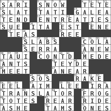 ACROSS 1. Indian skirt 5. Frozen precipitation 9. Wig 13. Narrow board 14. Jacques of French films 15. An organ shaped like a helmet 16. Look after 17. Pleas 19. Take to court 20. Call ___ day 21. Eastern Standard Time (abbr.) 22. Compass dir. 23. Beverages made from leaves 25. Portuguese money of account (variant) 26. Thick slices 30. Root beer relative 34. Spanish missionary in California 35. Afresh 36. "Change" in Tahitian 39. Continued (abbr.) 42. Ancient Persian 43. Pismires 44. Miss Universe 1986, Barbara Palacios _ 46. Confront 47. Approach 48. Distress signal 51. Immoral or dissolute person 54. Snakelike fish 57. Direct toward a target or goal 58. Area sheltered from the wind 60. Retirement account (abbr.) 62. Interpreter 65. Toadlike animal 66. Lugs 67. Bring up, as a child 68. Travel on or in a vehicle 69. American tennis player Robert 70. Scottish caps 71. Washington bills DOWN 1. Fast planes 2. Native American of Southwest Alaska 3. Indian princess (variant) 4. It would 5. Proofreading order 6. Nanny 7. Baseball player Mel 8. One who wires 9. Make lace 10. Writer Wiesel 11. Adolescent 12. Comfort 15. Yard entry 18. Compass dir. 20. Capri or Wight 24. Aid 27. Curve 28. Sis' sibling 29. Before Barbara or Clara 30. Device for capturing images 31. Single 32. Directed 33. Deep reverence 36. Scottish cap 37. One (Scot) 38. Shoshoni 40. Nine, plus one 41. Color 45. Have the gumption 48. Backtalk 49. Petroleum 50. Don Adams' spy role 52. Japanese brewing company 53. Eat (away) 54. Singer James 55. Greek god of love 56. Thin strip of wood or metal 58. Rich soil 59. Blunders 61. Ripens 63. Born 64. Beverage made from leaves 65. Back