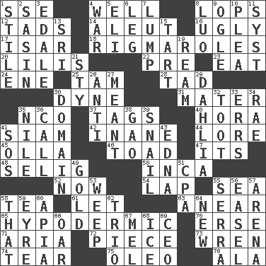ACROSS 1. Compass dir. 4. Water source 8. Chops off 12. Small amounts or degrees 14. Native American of Southwest Alaska 16. Repulsive 17. Austrian river, tributary to the Danube 18. Complicated, petty procedures 20. Ms. Damita and namesakes 22. Before (prefix) 23. Consume 24. Compass dir. 25. Scottish cap 28. Small amount or degree 30. Unit of force 31. Mother 35. Non-commissioned officer (abbr.) 37. Labels 40. Israeli folk dance 41. Thailand, formerly 42. Silly 44. Old wives' tales, e.g. 45. Water jar 46. Frog relative 47. It is 48. Former Milwaukee Brewers owner Bud 50. South American Indian 52. Immediately 54. Infant locale 55. Ocean 58. Afternoon social gathering 61. Allow 63. Approach 65. Below the epidermis 70. Celtic language 71. Operatic vocal solo 72. Part 73. Songbird 74. Lacerate 75. Margarine 76. In the manner of DOWN 1. Vertical member of a panel or frame 2. Indian antelope 3. Peak District village in England 4. Armed conflict 5. Connecticut Ivy Leaguer 6. Part of a journey 7. Mass 8. Nilotic language 9. Stare at amorously 10. Entreaty 11. System (abbr.) 13. _ Lanka 15. Small pie 19. 480, 500 or 516 sheets of paper 21. Filthy place 26. Opposed to 27. Intended 29. Mexican or Central American flower 30. Realm 32. A blast of a horn 33. Blunders 34. Actress Charlotte 35. The longest river in the world 36. Give a ring to 38. E Mali city 39. Slow-paced one 41. Distress signal 43. Pulitzer Prize-winning author Ferber 49. Aureate 51. Accounting whiz (abbr.) 53. Shed a tear 55. Spanish missionary in California 56. Artist's stand 57. Sports stadium 58. Not this but _ 59. Jane of fiction 60. Capital of Western Samoa 62. Musical group of three 64. ___ Haven, CT 66. Boat paddle 67. Cartoonist voice _ Blanc 68. Frozen water 69. Corporate head (abbr.)