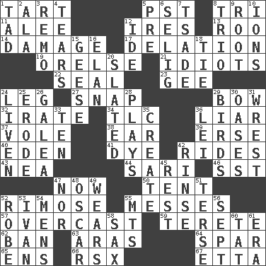 ACROSS 1. Small pie 5. Pacific Standard Time (abbr.) 8. Three (prefix) 11. Toward shelter 12. Angers 13. Friend of Pooh 14. Break 17. Accusation by an informer 19. Threatening words 21. Foolish or stupid persons 22. Lick closed 23. Unit of force equal to gravity 24. Part of a journey 27. Fastener 29. Arrow shooter 32. Feeling or showing extreme anger 34. Affectionate concern, for short 36. One who doesn't tell the truth 37. Grand slam 38. Hearing organ 39. Celtic language 40. Paradise 41. Color 42. Amusement-park features 43. Teachers' org. 44. Indian skirt 46. Fast jet (abbr.) 47. Immediately 50. Portable shelter 52. Full of chinks, cracks, or crevices 55. Makes clutter 57. Cloudy 59. Cylindrical with tapered ends 62. Bar 63. Ancient river in northeast Turkey 64. Coast Guard woman 65. Followers of ems 66. Acura sports coupe 67. Singer James DOWN 1. Bit 2. Insect wing 3. San ____ (Riviera town) 4. Rends 5. Before (prefix) 6. Former Milwaukee Brewers owner Bud 7. Sadhe (variant) 8. Musical group of three 9. Carrot, for example 10. Charged particles 12. Binary compound 15. Honkers 16. Enthusiasm 18. Neckwear 20. Scheduled 24. Make or become more lively 25. Wear away 26. An organ shaped like a helmet 28. Romps 29. Avian creatures 30. Fertile tracts in a desert 31. Obtain by seizing forcibly or violently 33. Nine, plus one 35. Make 36. Luau accessory 42. Wash lightly 45. State of inaction 47. Or not 48. Witty Wilde 49. Erodes 51. Laconic 52. Loose flowing garment 53. "Terrible" tsar 54. Not women's 55. Mountains (abbr.) 56. Back-to-school mo. 58. Saxophone 60. Make lace 61. Epoch