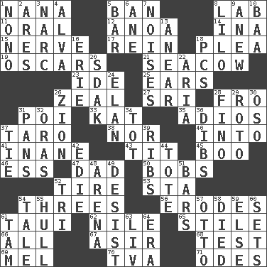 ACROSS 1. Nanny 5. Forbid 8. Experiment locale 11. Spoken 12. Small Philippine buffalo 14. _ tizzy (2 wds.) 15. Impudent aggressiveness 17. It's straight from the horse's mouth 18. Entreaty 19. Motion picture awards 21. Manatee 23. Binary compound 25. Hearing organs 26. Ardor 27. _ Lanka 28. Back 31. Luau course 33. Krazy ___ of comics 35. Goodbye (Sp.) 37. Edible starchy tuberous root 38. Or not 40. To the inside or interior of 41. Lacking in sense or substance 43. Teat (slang) 45. Sometimes accompanies a hiss 46. Curvy letter 47. June honoree 50. Moves up and down 52. Become fatigued 53. R.R. building 54. Triplets 56. Eats (away) 61. "Change" in Tahitian 62. Mediterranean tributary 65. Vertical member of a panel or frame 66. 100% 67. SW Saudi Arabia district 68. Trial 69. Cartoonist voice _ Blanc 70. Federal power corp. 71. Lyric poems DOWN 1. Words to Nanette 2. Ancient Greek god of war 3. Drug cop 4. Inventor's middle name 5. Oblong piece of solid material 6. One (Scot) 7. Annoying sounds 8. _ and Stitch 9. Afresh 10. Sound made by sheep 13. Approach 16. 4th largest of the Great Lakes 18. Personal Computers (abbr.) 20. Neighbor of Neb. 22. Operatic vocal solo 24. Style 26. The Jewish people; Israel 28. A pale, very dry sherry 29. Printing process, for short 30. Bear (Spanish) 31. Zero-star reviews 32. Mouths or openings 34. Small child 36. Claim 37. Make a knot 39. Teases 42. Singer Brickell 44. Haul 48. Sports stadium 49. Stop 51. Drinking establishments 52. Three (prefix) 54. Falsehood 55. Frame or body of a ship 57. Von Bismarck 58. Passed on 59. Otherwise 60. Puts into a specified state 61. Scottish cap 63. 54 in ancient Rome 64. Epoch