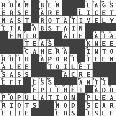 ACROSS 1. Wander 5. Benjamin's nick name 8. Fails to keep up a pace 12. Celtic language 13. "We ___ not amused" (Victoria) 14. It is permitted: Lat. 15. Political cartoonist Thomas 16. Happening in regular succession 19. Call ___ day 20. Refrain by choice 21. Arab leader 23. Had dinner 24. "One Day ___ Time" 27. Beverages made from leaves 30. Leg joint 31. Device for capturing images 34. To the inside or interior of 35. Writer of Portnoy's Complaint (1969) 38. To the left, to Queeg 40. Adolescent 41. Toward shelter 42. Rest room 44. Backtalk 45. 43,560 square feet 46. Newt 47. Double-curved letter 50. Opposed to 53. Curse 57. Increase 59. Census information 63. Entreaty 64. Disturbances 65. Lower and raise head in agreement 66. Dry up 67. Writer Wiesel 68. Begley and Asner 69. Capri or Wight DOWN 1. Painter Guido (1575-1642) 2. Speak pompously 3. Indian state 4. Was introduced to 5. Sharp remark 6. Greek god of love 7. Remaining after all deductions 8. 54 in ancient Rome 9. Adept person 10. Set 11. Filthy place 14. Actor's bit 17. Auto club (abbr.) 18. Teat (slang) 20. Type of rug 22. Strong, restless desires 24. Singer Murray 25. Wig 26. Period of immesurable duration 28. Housemaid (var.) 29. Back-to-school mo. 30. Baby cat 32. Friend of Pooh 33. Roberta Peters solo 35. Raze (variant) 36. Norwegian king 37. Trial 39. Affectionate concern, for short 43. Part of Q.E.F. 47. Snakelike fish 48. Health resort 49. Be seated 51. Falsehoods 52. Standard of perfection 54. Prong on a fork 55. Parka part 56. Conclusions 58. Have the gumption 59. Before (prefix) 60. Lubricate 61. Luau course 62. Shoshoni 63. Air pressure measure (abbr.)