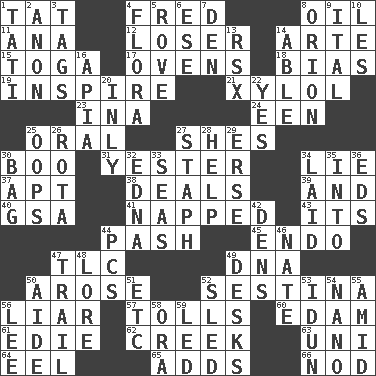 ACROSS 1. Make lace 4. Flintstone 8. Lubricate 11. Santa ___, CA 12. Failure 14. Johnson of "Laugh-In" 15. Ancient Roman robe 17. Baking chambers 18. Prejudice 19. Heighten or intensify 21. Xylene (variant) 23. _ tizzy (2 wds.) 24. Car or cant ending 25. Taken by mouth 27. "______ My Girl" (Turtles hit) 30. Surprise greeting 31. Next before 34. Whopper 37. Fitting 38. Allots cards 39. Also 40. Girls' org. (abbr.) 41. Slept 43. ___ a Wonderful Life 44. Romantic infatuation 45. Inside; within (prefix) 47. Affectionate concern, for short 49. Heredity factor (abbr.) 50. Came up 52. French poetic form 56. One who doesn't tell the truth 57. For Whom the Bell _____ 60. Dutch treat 61. Singer Brickell 62. Small stream 63. University (slang) 64. Snakelike fish 65. Sums up 66. Dreamland DOWN 1. Jacques of French films 2. At once, immediately (arch.) 3. Labels 4. Plants 5. Be footloose 6. Compass dir. 7. Lair 8. Constellation of myth 9. Slanted text style (abbr.) 10. French article 13. Acura sports coupe 14. Competent 16. Capital of Western Samoa 20. In an inward manner 22. It is so 25. I made a mistake 26. Roll call or roster of names 27. Staphylococcus 28. Assist 29. Celtic language 30. Paper or plastic container 32. Pulitzer Prize-winning author Ferber 33. Oceans 34. Put down 35. To the inside or interior of 36. Begley and Asner 42. Cub Scout units 44. Personal Computers (abbr.) 46. Nathan's nickname 47. Drop behind 48. Old wives' tales, e.g. 49. Writing tables 50. Helper 51. And so on (abbr.) 52. Downhill vehicle 53. Goddess of spring and wife of Bragi 54. Billionth: prefix 55. Among 56. Area sheltered from the wind 58. Mouth or opening 59. Directed