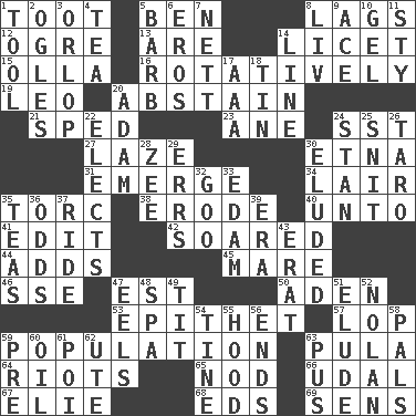 ACROSS 1. A blast of a horn 5. Benjamin's nick name 8. Straggles 12. Legendary monster 13. "We ___ not amused" (Victoria) 14. It is permitted: Lat. 15. Water jar 16. Producing rotation 19. Lion 20. Choose not to consume 21. Moved rapidly 23. One (Scot) 24. Fast jet (abbr.) 27. Goldbrick 30. Inactive volcano in Sicily 31. Develop 34. Den 35. Torque (variant) 38. Eat (away) 40. To (old English) 41. Prepare for publication 42. Flew 44. Sums up 45. Female horse 46. Compass dir. 47. Eastern Standard Time (abbr.) 50. An important port of Yemen 53. Curse 57. Chop off 59. Census information 63. Monetary unit of Botswana 64. Debaucheries 65. Dreamland 66. Hereditary estate 67. Writer Wiesel 68. Begley and Asner 69. Elected reps. DOWN 1. Instrument 2. Stares at amorously 3. Fourth or lowest deck 4. Beverage made from leaves 5. Sharp remark 6. Greek god of love 7. Remaining after all deductions 8. 54 in ancient Rome 9. Adept person 10. Set 11. Filthy place 14. Actor's bit 17. American Automobile Association (abbr.) 18. Shallow baking pan 20. First man 22. Opts 24. Comedian Laurel of Laurel & Hardy 25. In a ____ (agitated or irritated) 26. Pacific island yam 28. Last letter of the English alphabet 29. Blunders 30. Dodged 32. Thick or sticky substance 33. Dutch treat 35. Afternoon social gatherings 36. Likelihood 37. Travel on an animal 39. Period 43. Part of Q.E.F. 47. Snakelike fish 48. Health resort 49. Teat (slang) 51. Evade 52. Pitcher Ryan 54. Prong on a fork 55. Parka part 56. Conclusions 58. Friends 59. Before (prefix) 60. Petroleum 61. Luau course 62. Shoshoni 63. Festering