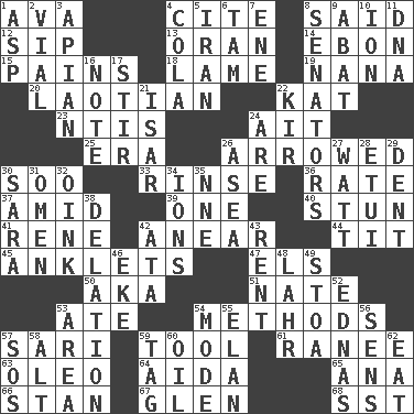ACROSS 1. Actress Gardner 4. Quote 8. Stated 12. Small drink 13. Northwest Algerian city 14. Inky black, to poets 15. Aches 18. Unable to walk 19. Grandmother 20. Of or relating to Laos or its people 22. Krazy ___ of comics 23. Nuclear Threat Initiatives 24. Small island 25. Period 26. Moved like an arrow 30. "Barney Miller" actor Jack 33. Wash lightly 36. Assign a rank or rating to 37. Among 39. Single 40. Make senseless or dizzy 41. French philosopher Descartes 42. Approach 44. Teat (slang) 45. Short socks 47. Raised railways 50. Alias (abbr.) 51. Nathan's nickname 53. Had dinner 54. Modes 57. Indian skirt 59. Implement 61. Indian princess (variant) 63. Butter sub 64. Opera by Verdi 65. Santa ___, CA 66. Comedian Laurel of Laurel & Hardy 67. Small, secluded valley 68. Fast jet (abbr.) DOWN 1. Cleo's killer 2. Small bottle 3. Bee-related 4. Root beer relative 5. SW Asia republic 6. Scottish cap 7. Compass dir. 8. Legislators 9. Blind as ____ 10. Electrically charged atom 11. Heredity factor (abbr.) 16. Brief written record 17. Use a swizzle stick 21. Austrian river, tributary to the Danube 22. Apertif with cassis 24. "We ___ not amused" (Victoria) 26. Toward the sea 27. Electrical Unit 28. Needle holder 29. Gouge 30. "Two Mules for Sister ____" 31. Presage 32. Pig sound 34. Charged particles 35. Compass dir. 38. Conveyance 42. _ moment's notice (2 wds.) 43. Monthly bill 46. Make supply last 48. Cowardly lion portrayer 49. Portico 52. Ferber et al. 53. Length times width 54. Method 55. Style 56. Elected reps. 57. Distress signal 58. The first octave above the treble staff 59. Label 60. Petroleum 62. Erode
