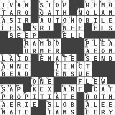 ACROSS 1. _ the terrible 5. Close up, plug up 9. San ____ (Riviera town) 13. Edible starchy tuberous root 14. Pledge 15. Pitcher Ryan 16. SW Saudi Arabia district 17. Form of transportation 19. French article 20. _ Lanka 21. Born 22. Raised railways 23. Ooze 25. Pipe bend 26. Role for Stallone 30. Entreaty 34. Channel Islands abalone 35. Age 36. Put down 39. Maternal 42. Transmit 43. Singer Murray 44. A color or tint 46. Necklace unit 47. Follow as a consequence or result 48. Single 51. Soared 54. Plant excrement 57. Dry husk or covering 58. Sandy's bark 60. Feline 62. Appease 65. Writer of Portnoy's Complaint (1969) 66. Nest on high 67. Oscar Madison type 68. Toward shelter 69. Nathan's nickname 70. Scottish caps 71. Suggestive of the supernatural DOWN 1. Slanted text style (abbr.) 2. Flower holders 3. Get up 4. Or not 5. Fly high 6. "Change" in Tahitian 7. Baseball player Mel 8. Give a jingle 9. Director Reiner 10. Writer Wiesel 11. Shopping center 12. Singles 15. Christmas carol 18. Cartoonist voice _ Blanc 20. Practice fight 24. Worn away 27. Madame (abbr.) 28. Benjamin's nick name 29. Speak pompously 30. Soft color 31. Area sheltered from the wind 32. A really long time 33. Added to 36. Experiment locale 37. A saturated hydrocarbon 38. _ tizzy (2 wds.) 40. Shallow baking pan 41. Followers of ems 45. _ links 48. Migrant worker of the '30s 49. Fish or hair follower 50. Be extant 52. Learning spot: Fr. 53. Wetness 54. Connect, as a bridge 55. Type of rug 56. Left side of a ship or aircraft 58. Smallest unit of an element 59. Confederate soldiers (slang) 61. Those people 63. Sliced dessert 64. Wing 65. Actress Charlotte