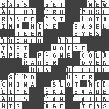 ACROSS 1. Backtalk 5. Put into a specified state 8. ___ Haven, CT 11. Native American of Southwest Alaska 13. Adept person 14. Introduce or present, as a question 15. Indian princess (variant) 16. Eastern Standard Time (abbr.) 17. Globular water bottle used in Asia 18. _ tizzy (2 wds.) 19. Flintstone garb 21. Artist's stand 22. Adolescent 24. Sight organs 25. Pressed 27. Pipe bend 29. Small pie 30. Annoying sound 32. Domed church section 33. Give a jingle 35. Root beer relative 39. Less widely known 41. Baking chamber 42. Benjamin's nick name 43. Erase 45. Oscar Madison type 48. One who makes use of a thing 49. Large country 50. Groove 52. To free from 55. Welles in "The Third Man" 56. What Jean-Claude Killy likes to do 57. Elude 59. Ancient Greek god of war 60. Baking dish 61. Eroded 62. Mountains (abbr.) 63. Ripen 64. Afternoon social gatherings DOWN 1. Indian skirt 2. ____ Jay Lerner 3. Elected representatives 4. Take to court 5. Moved rapidly 6. Celtic language 7. Small child 8. Trap for birds or small mammals 9. _____ Park, CO 10. Welt 12. Giggle 14. Frolic 20. Working for oneself (abbr.) 21. Snakelike fish 23. Keyboard key 25. Call ___ day 26. Hit sharply and swiftly 27. Age 28. Untruth 30. Or not 31. Learning spot: Fr. 33. Before (prefix) 34. Layer 36. Make much ado about nothing 37. Allow 38. A saturated hydrocarbon 40. Swedish rock group 43. Superhero pair 44. First name in cosmetics 45. Upper-body garment 46. Citrus fruits 47. Singles 49. Dollar (slang) 50. Heroin 51. Actor's bit 53. The main thing one is thinking about 54. Hiding places for outlaws 56. Health resort 58. Large container